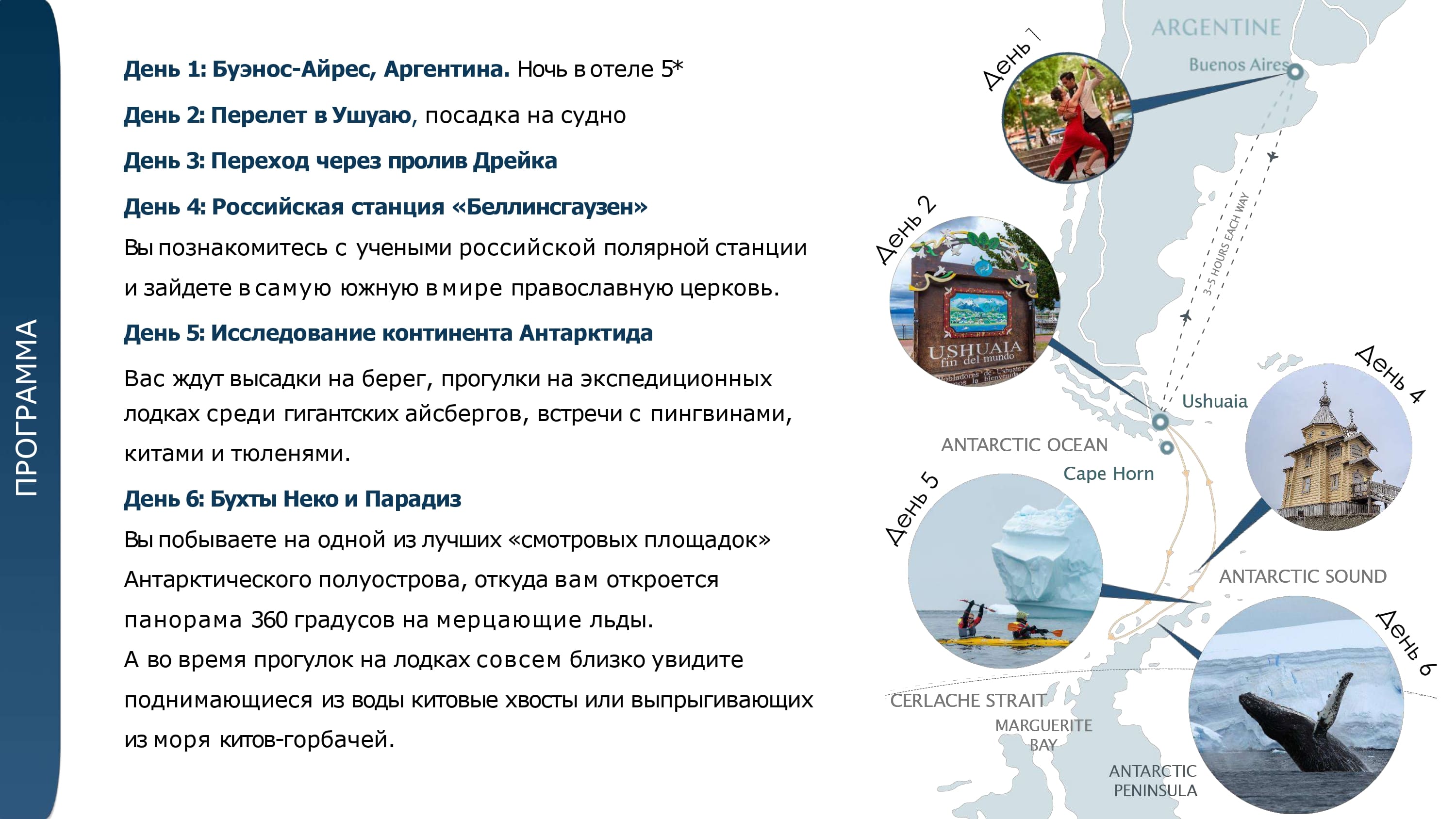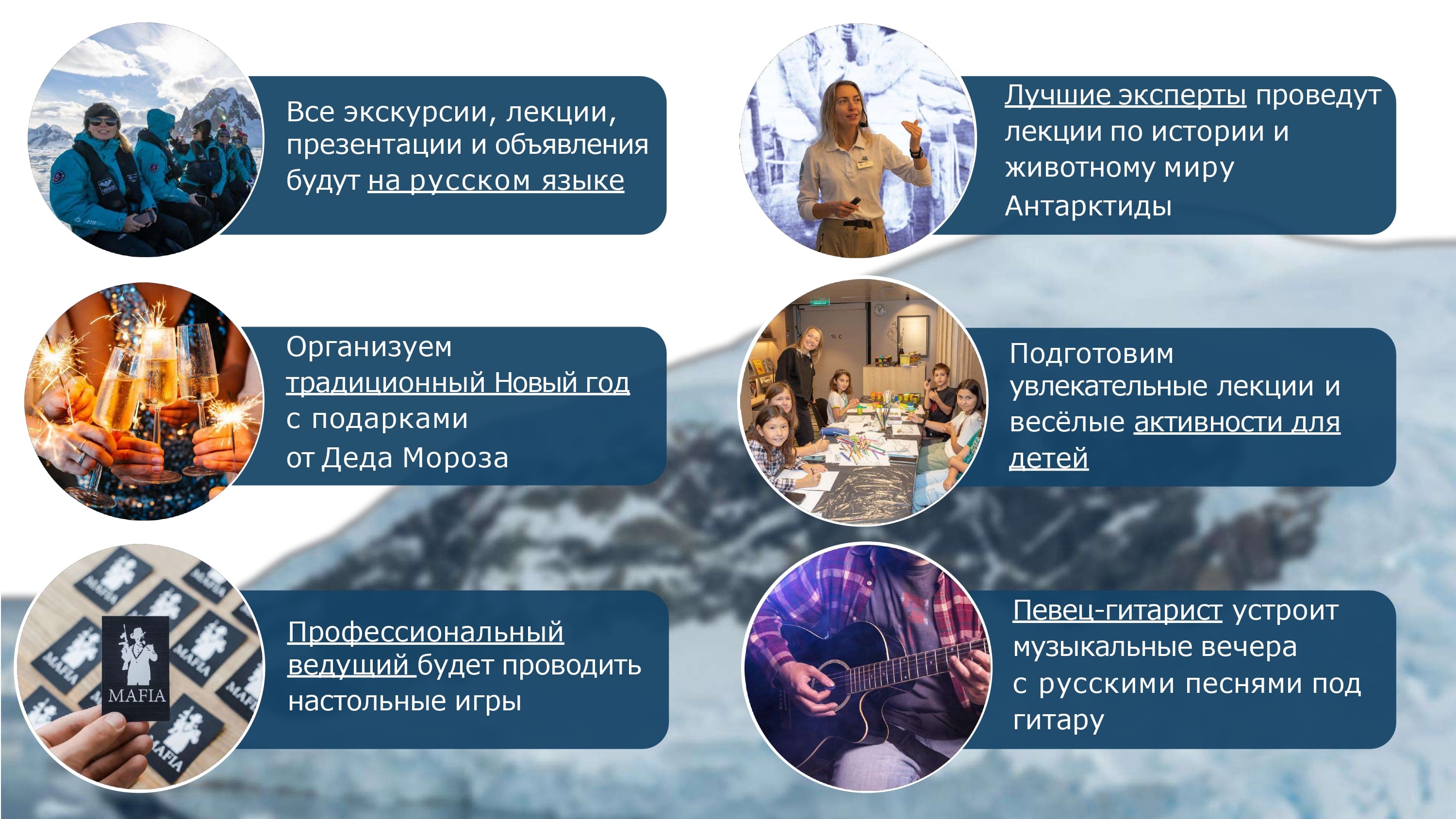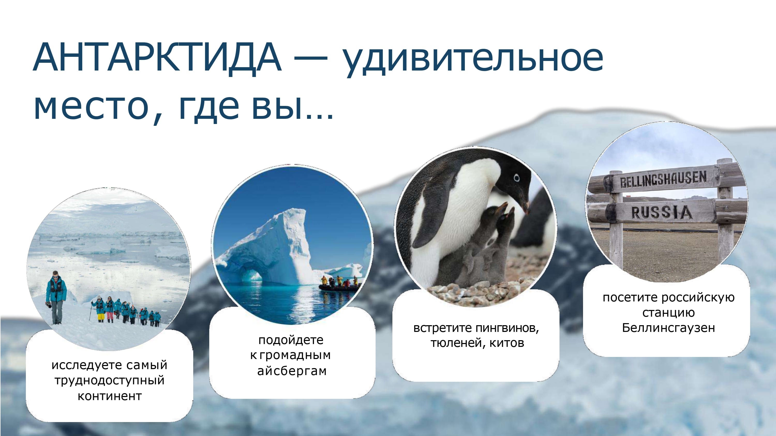 - Запланированное посещение российской полярной станции «Беллинсгаузен», рядом находится самый южный в мире православный храм;