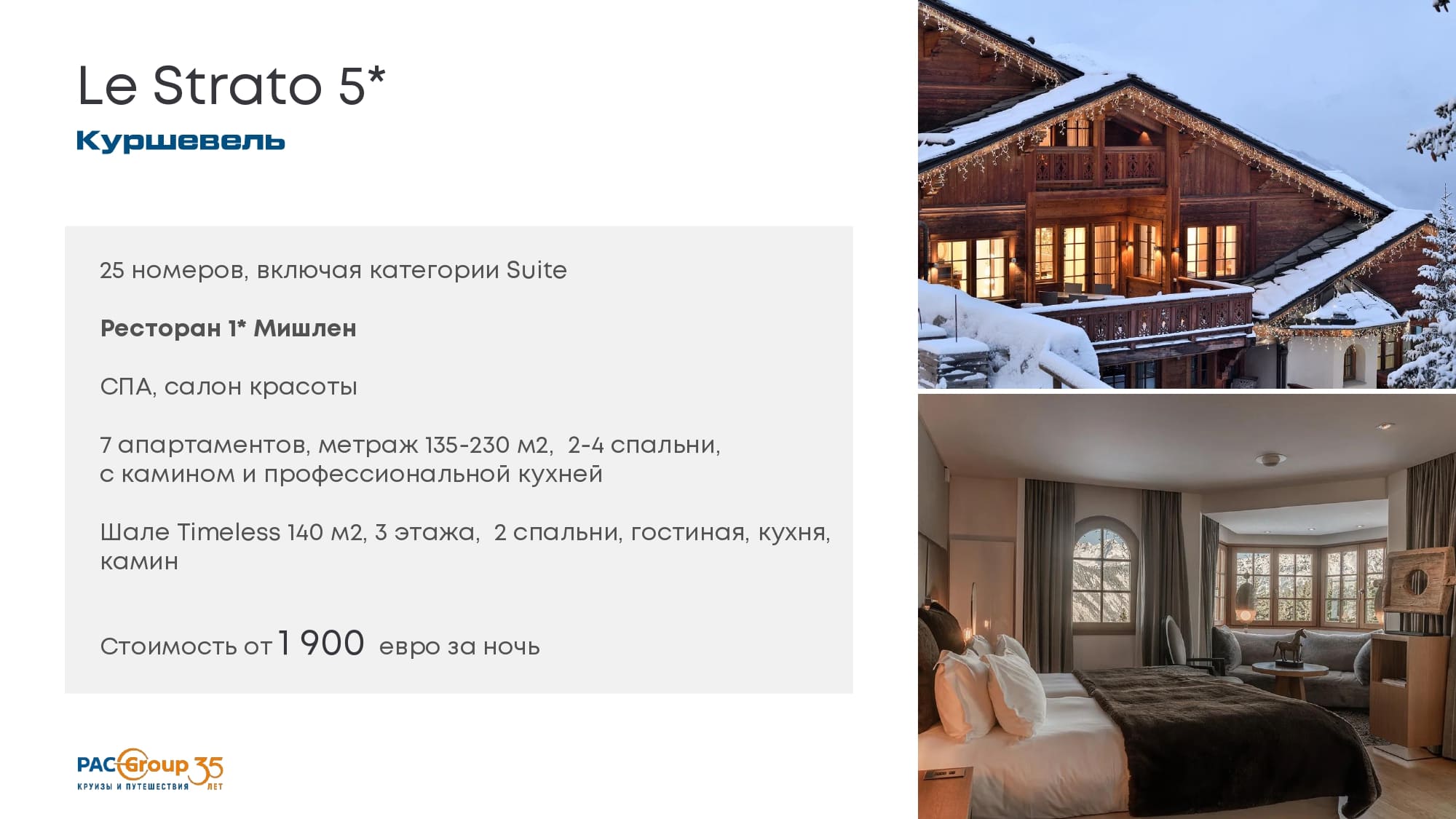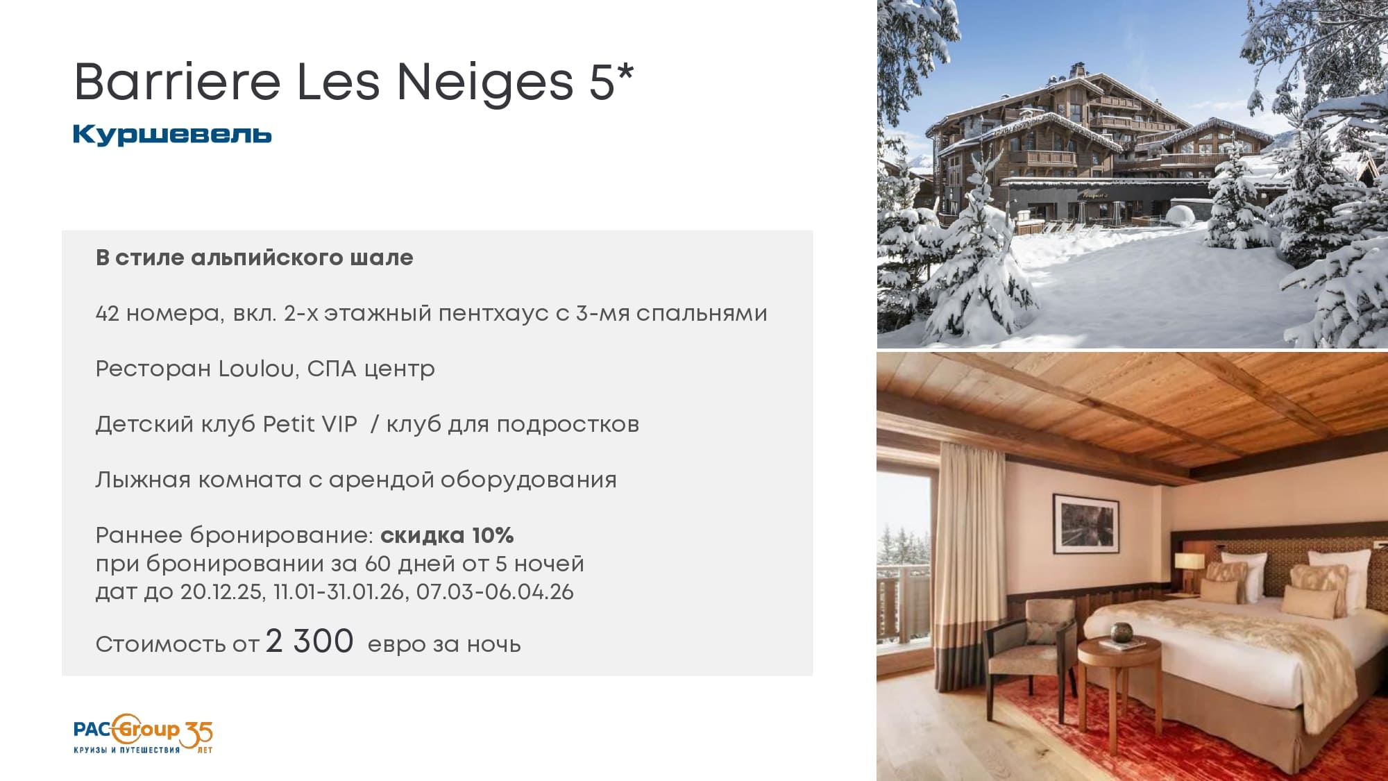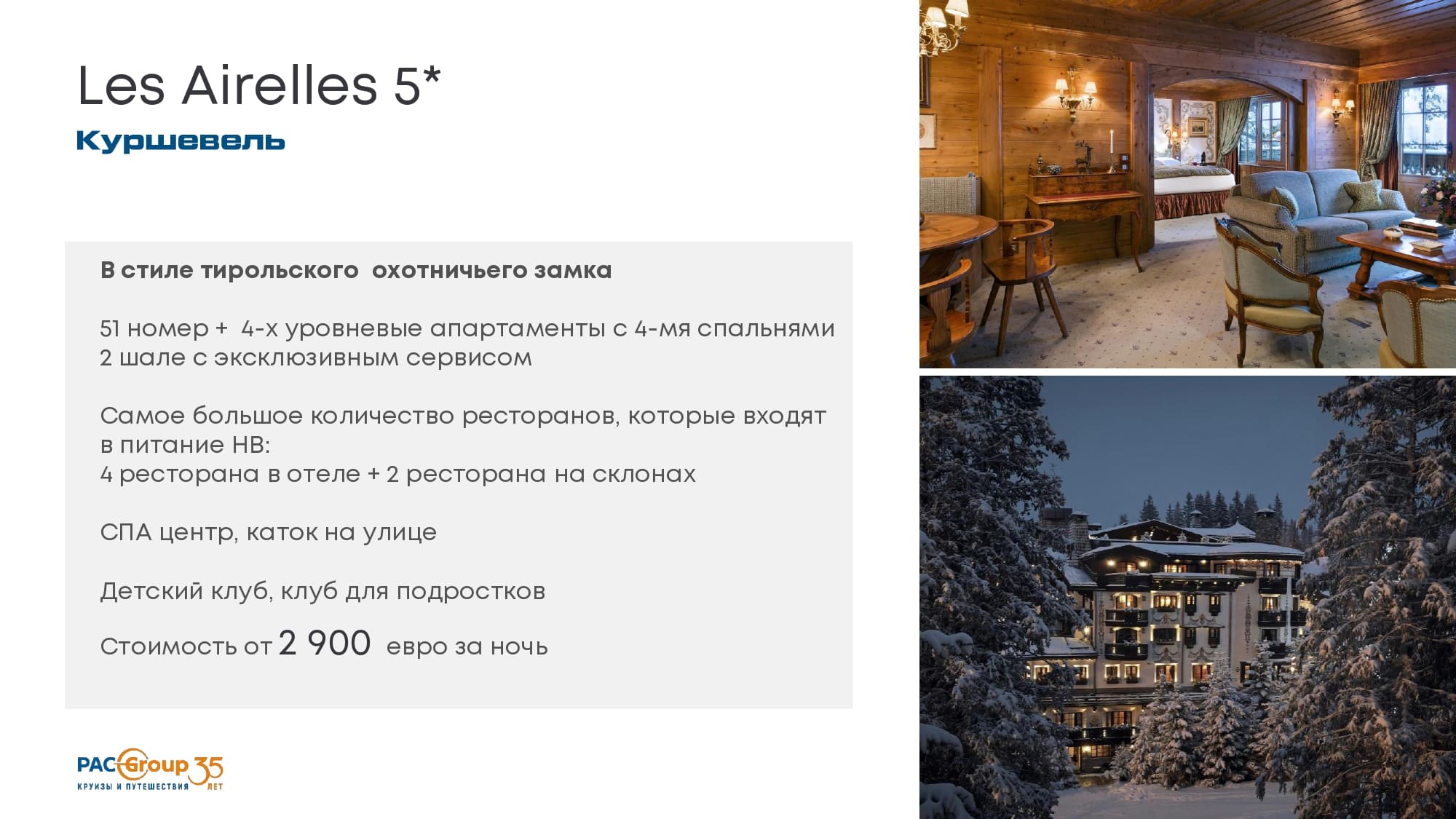 Отель в стиле альпийского шале, стоимость от 2300 евро в низкий сезон.42 номера, вкл. 2-х этажный пентхаус с 3-мя спальнями