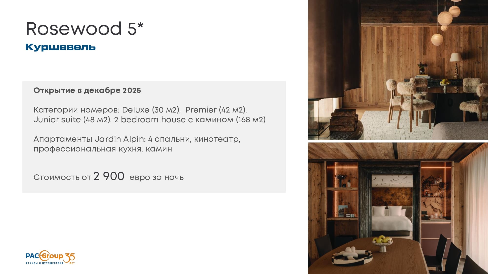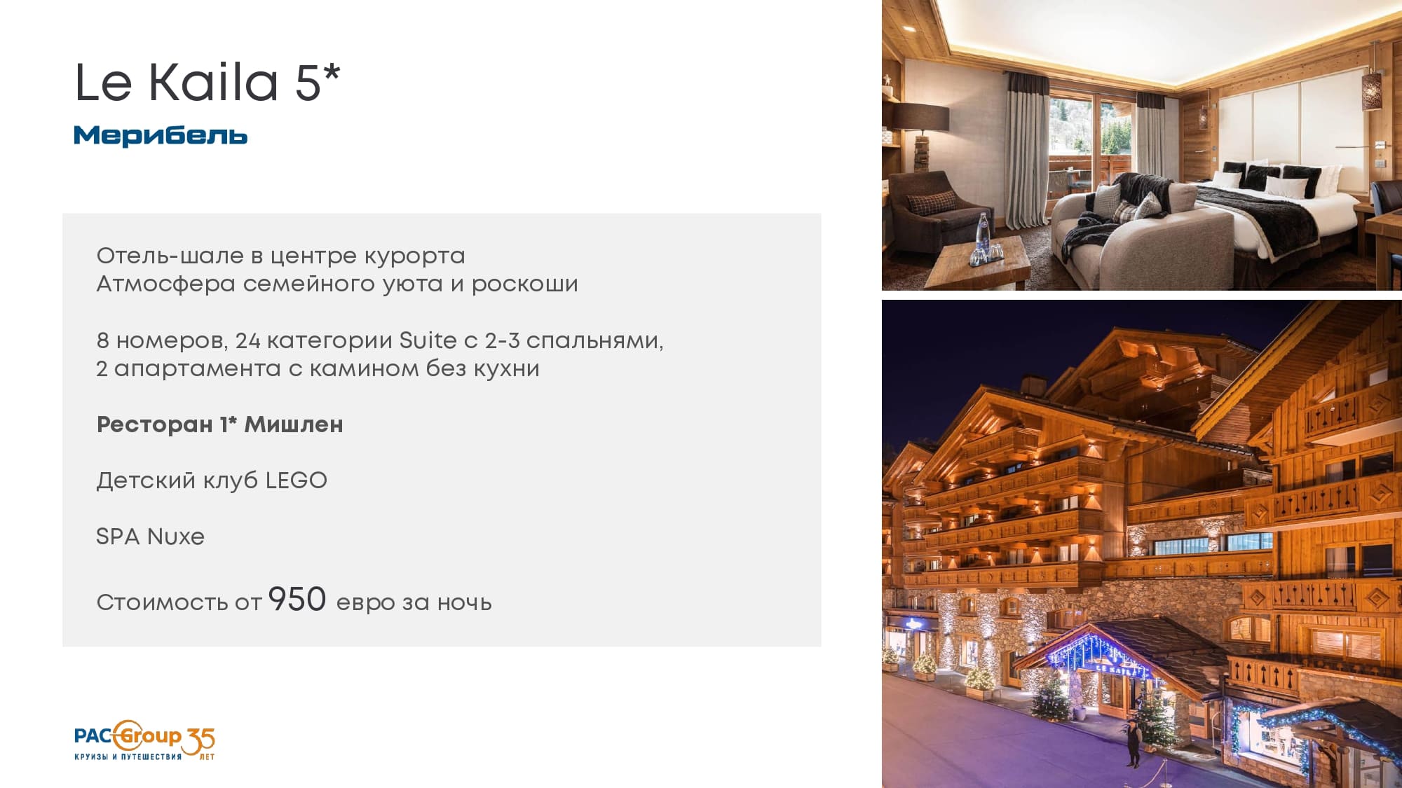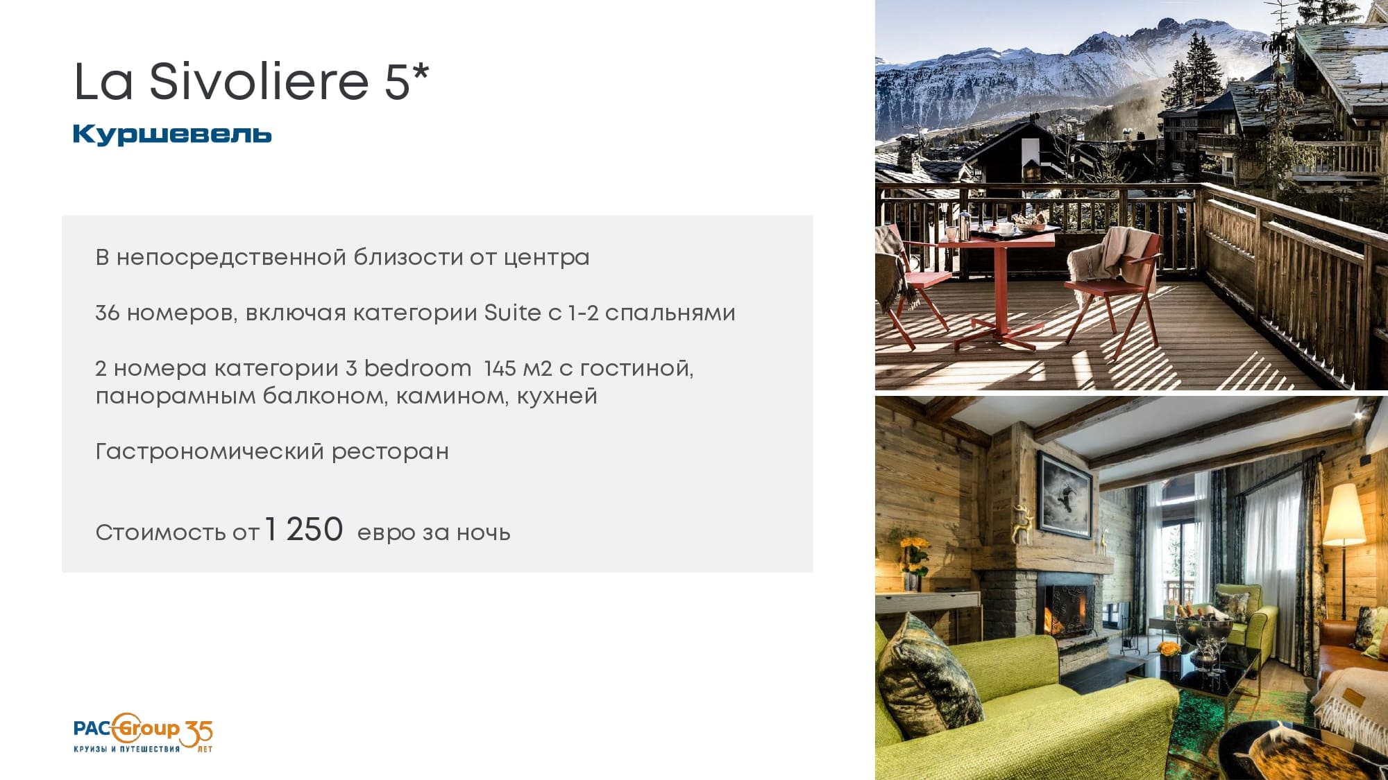 Отель в стиле альпийского шале, стоимость от 2300 евро в низкий сезон.42 номера, вкл. 2-х этажный пентхаус с 3-мя спальнями