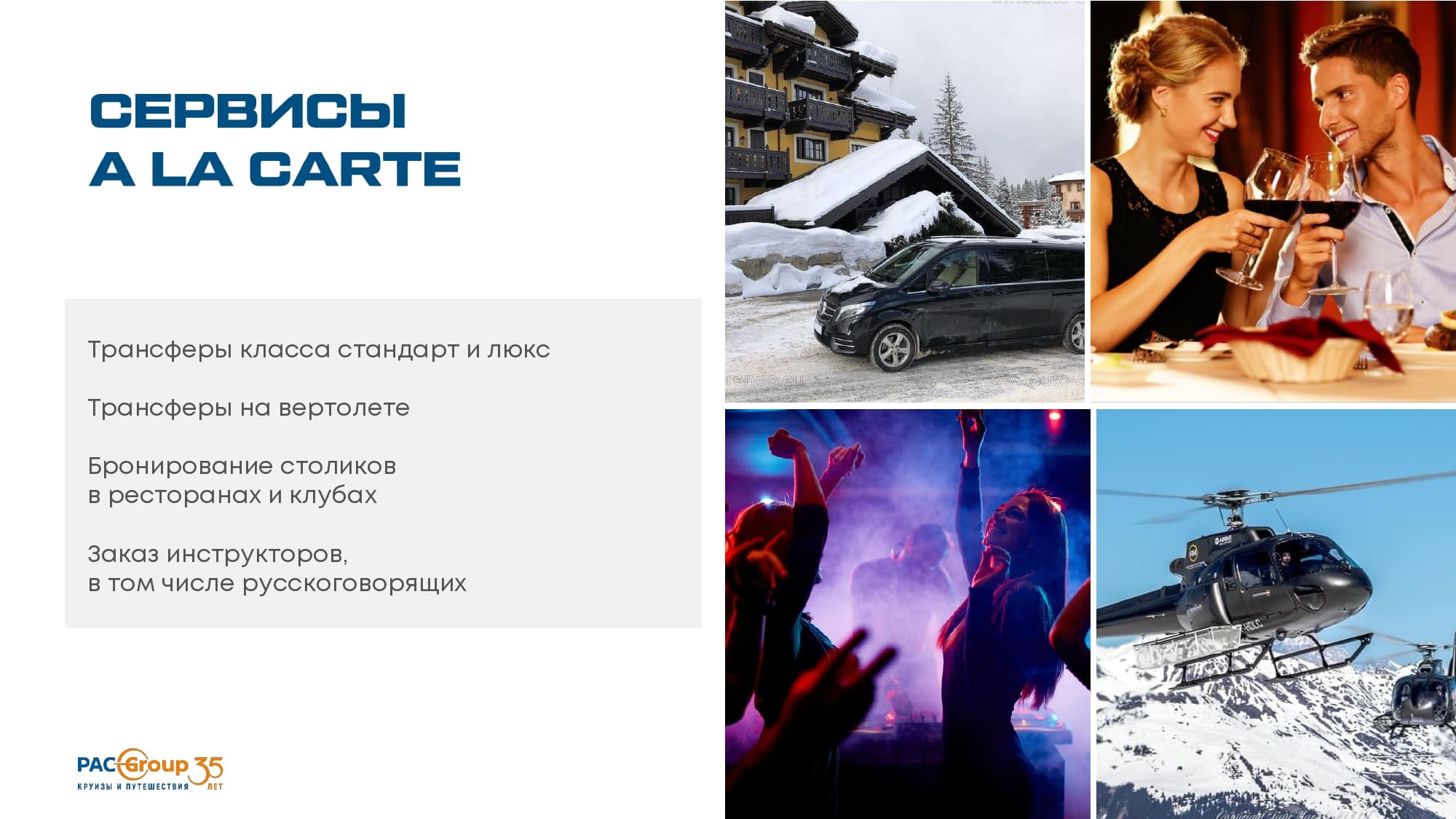 • Возможны трансферы на вертолёте от аэропортов Женевы, Леона и Ниццы, но они могут быть отменены из-за погоды.