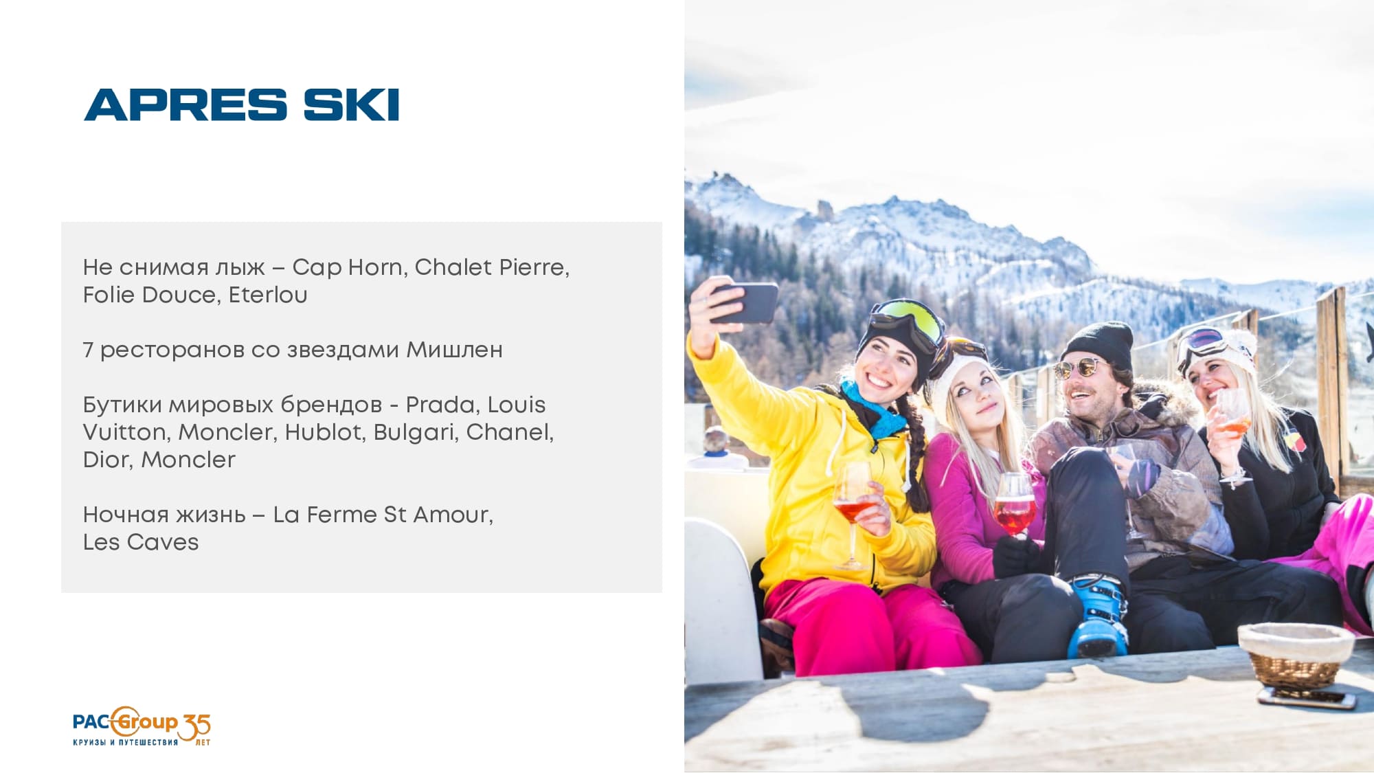 Не снимая лыж – Cap Horn, Chalet Pierre,Folie Douce, Eterlou