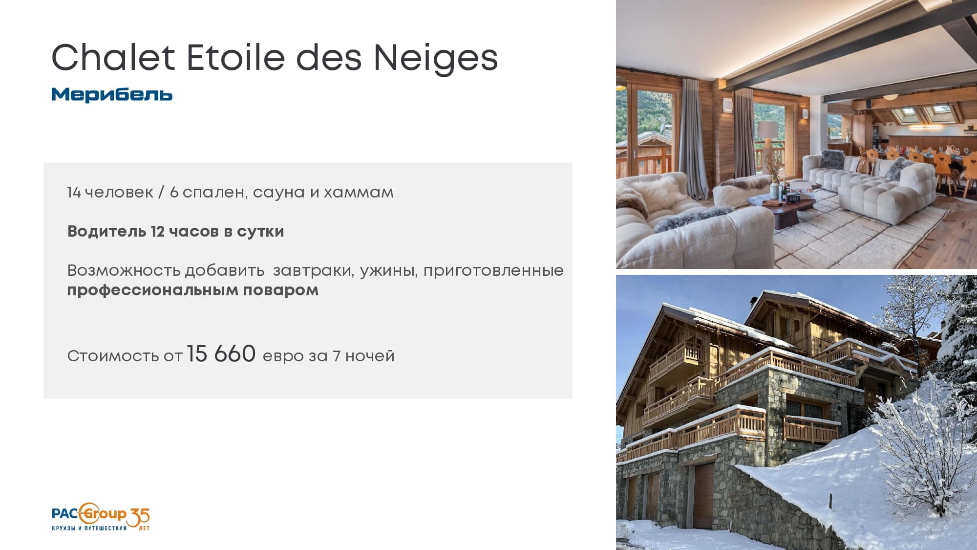 Стартовая цена шале в низкий сезоне12000-15000 евро в стуки, в высокий сезон 140000-150000 еров за неделю