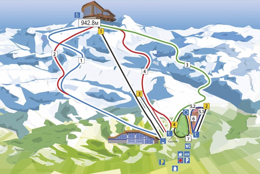 Трассы для начинающих (зеленые), Средний ровень (синие), Сложные трассы (красные), Фрирайд |