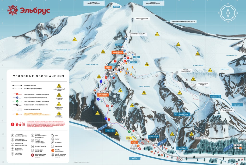Трассы для начинающих (зеленые), Средний ровень (синие), Сложные трассы (красные), Для экспертов (черные), Фрирайд |