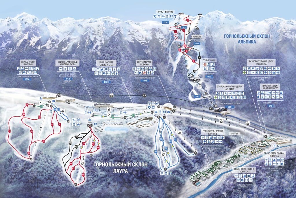 Трассы для начинающих (зеленые), Средний ровень (синие), Сложные трассы (красные), Для экспертов (черные) |