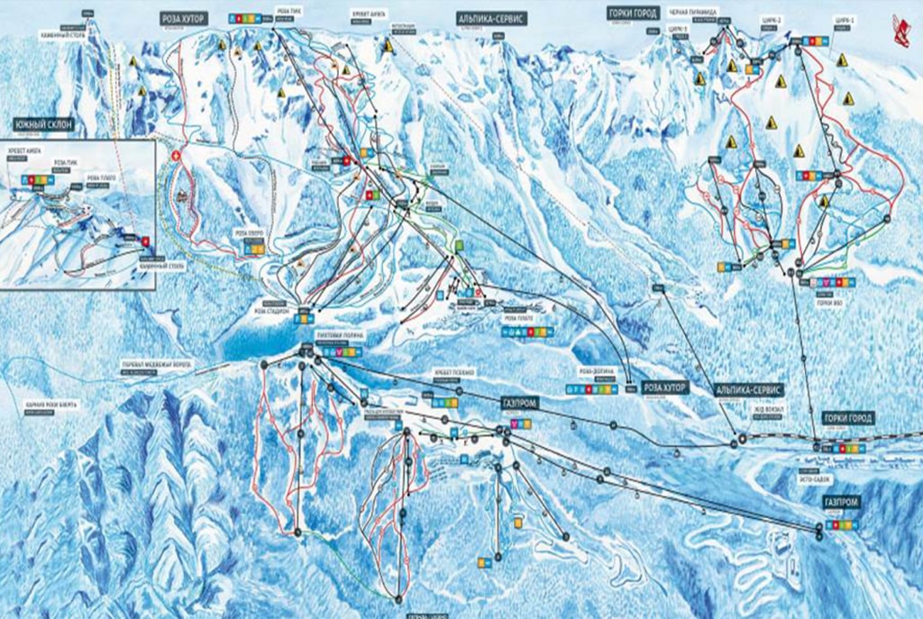 Трассы для начинающих (зеленые), Средний ровень (синие), Сложные трассы (красные), Для экспертов (черные) |