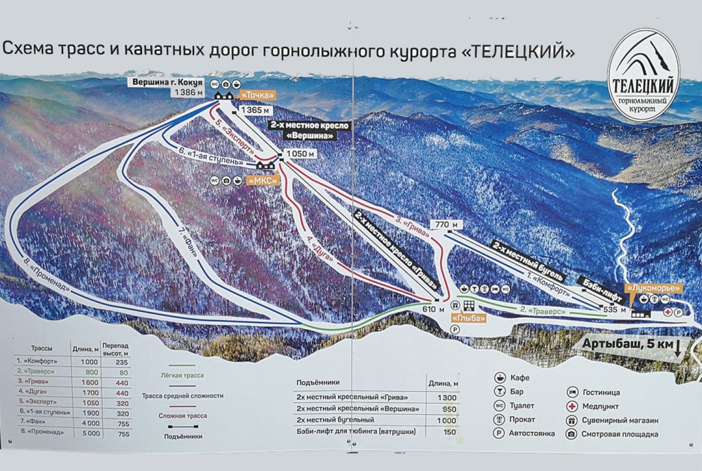 Трассы для начинающих (зеленые), Средний ровень (синие), Сложные трассы (красные) |