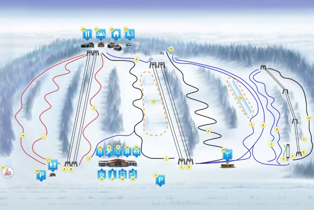 Трассы для начинающих (зеленые), Средний ровень (синие), Сложные трассы (красные), Для экспертов (черные) |