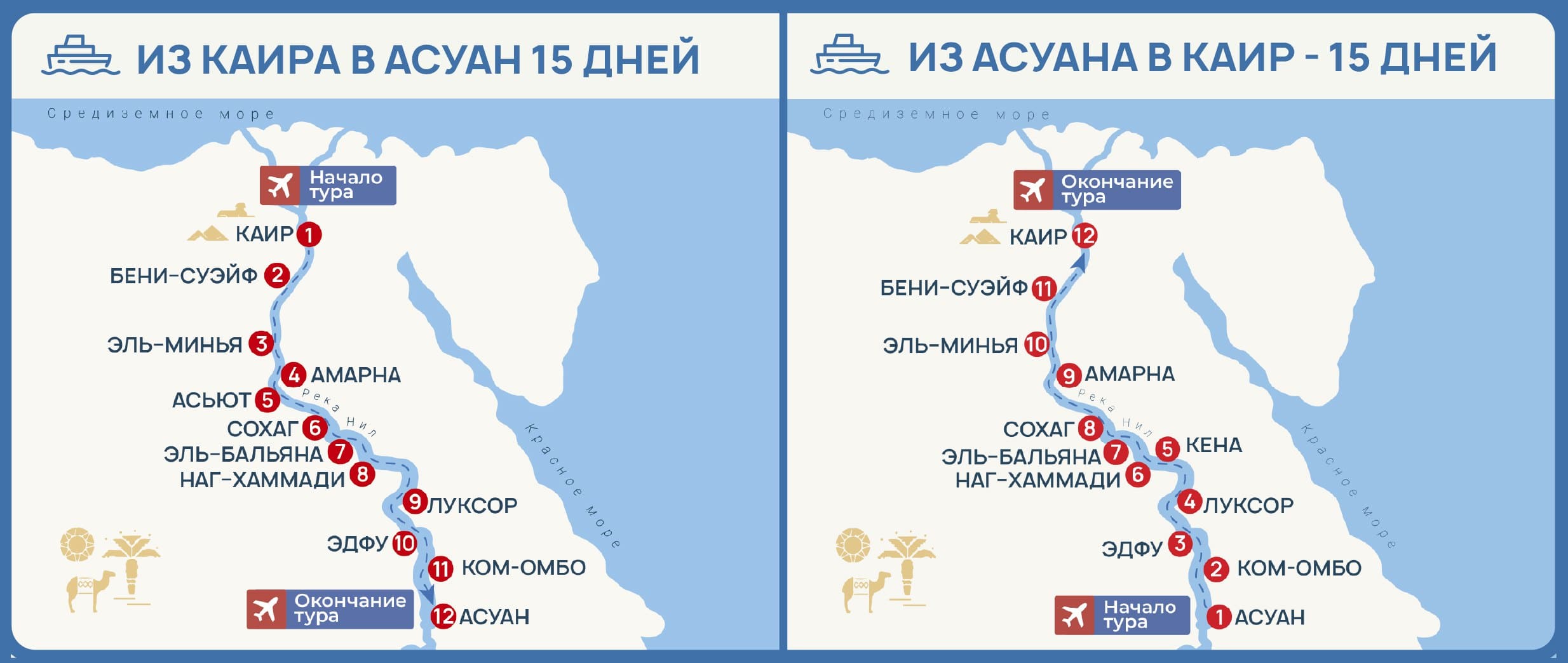В одном путешествии вы пройдёте как популярный участок реки Нил от Луксора до Асуана на теплоходе Jaz Crown Jubilee, так и редкий от Асуана до Абу-Симбела на Steigenberger Omar El Khayam.