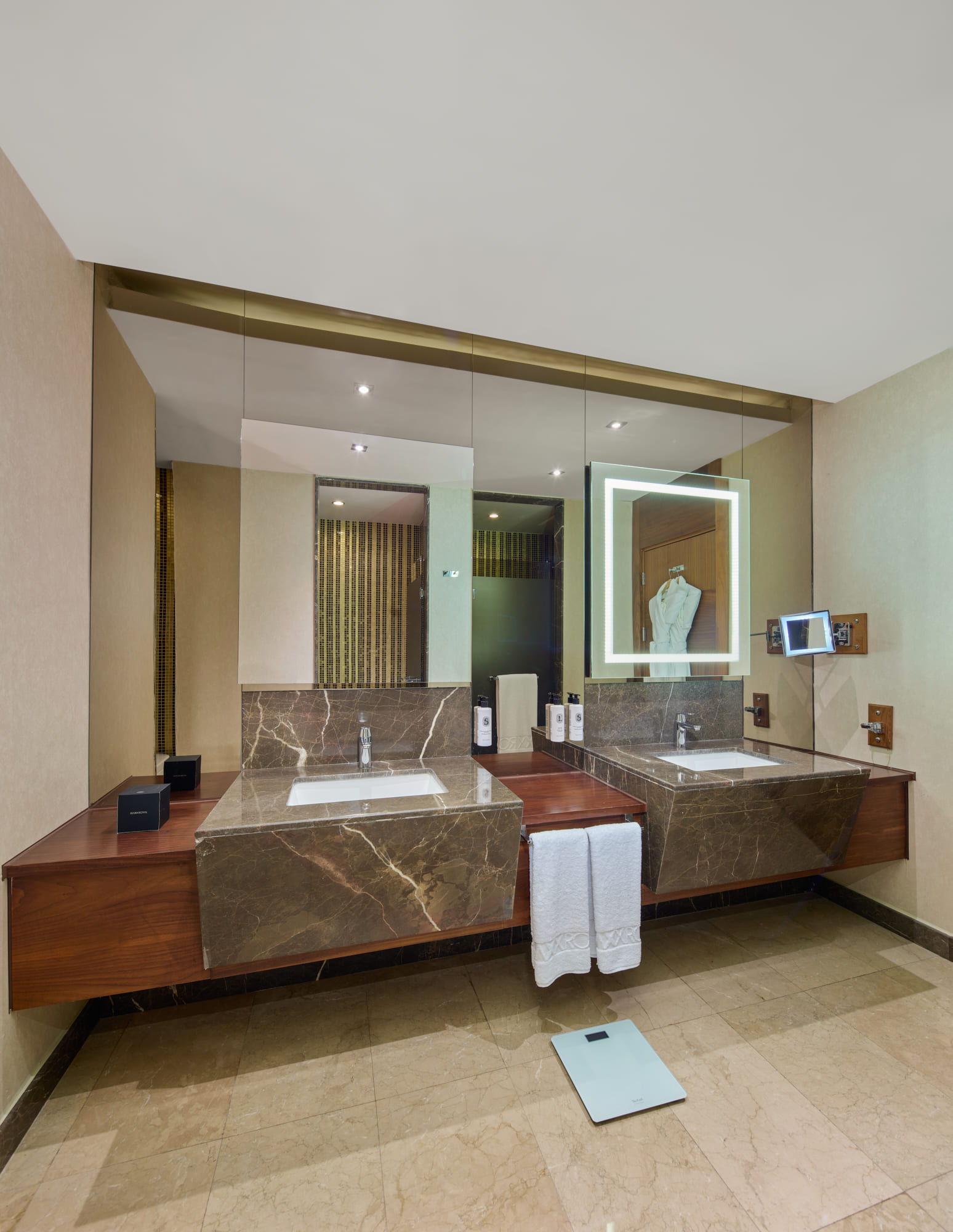 Банные и душевые принадлежности премиального класса, Ванна, Весы цифровые (электронные), Гардеробная с ключом и полкой для багажа, Джакузи, Душ / Душевая кабина, Зеркало для макияжа/бритья с подсветкой квадратное, Набор женских банных принадлежносей, Набор мужских банных принадлежносей, Тапочки, Тропический (дождевой) душ квадратный, Фен, Халаты |