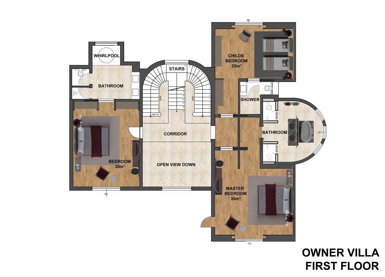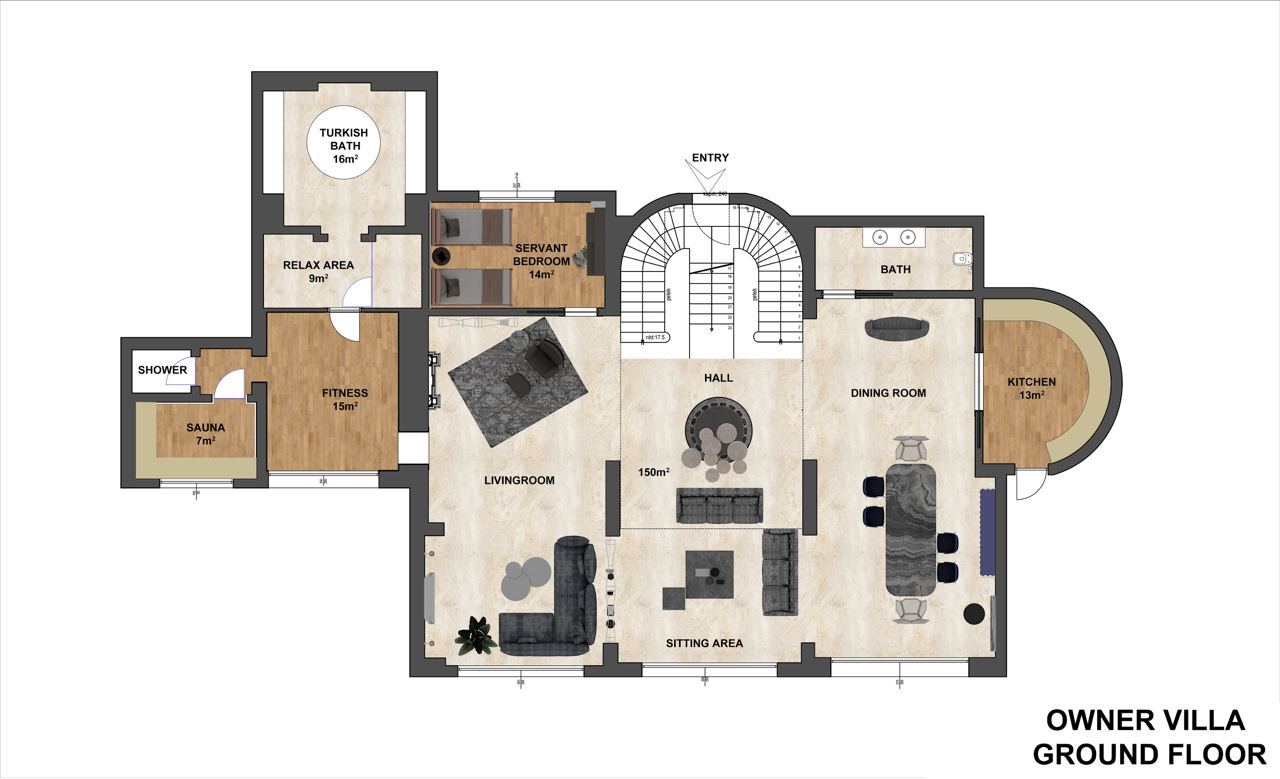 - 1 двухуровневая Owner Villa (расположена на гольф-поле Монтгомери, на первом уровне: частный открытый бассейн (с подогревом в зимний период), павильон с джакузи, гостиная, спальня, обеденная зона, кухня, турецкая баня, ванная комната с сауной и душем, комната для фитнеса, терраса; на втором уровне: 3 спальни с дверью, ванная комната с джакузи и душем с комнатой для массажа и пилинга, 1 ванная комната с джакузи и душем, 1 ванная комната с душем, 3 балкона, макс. 12 чел.+инф, 630 м2, VIP-сервис).