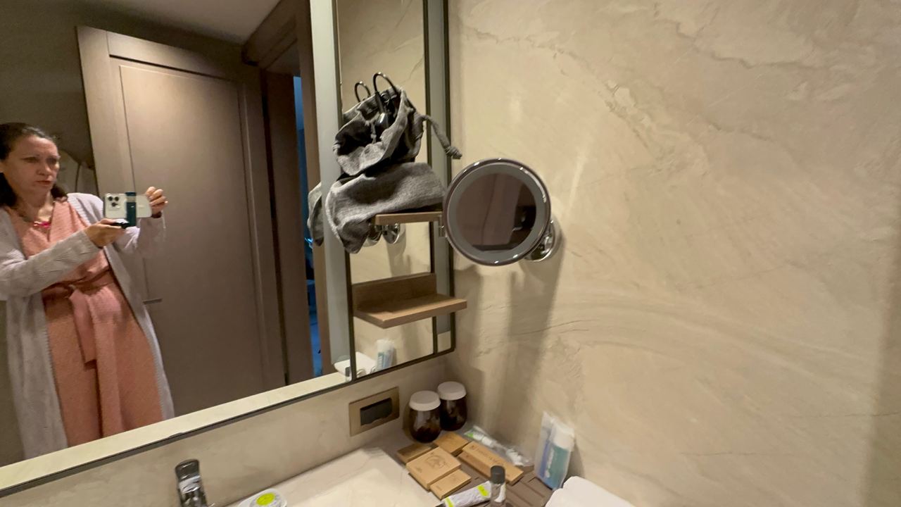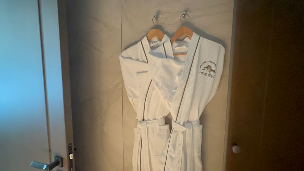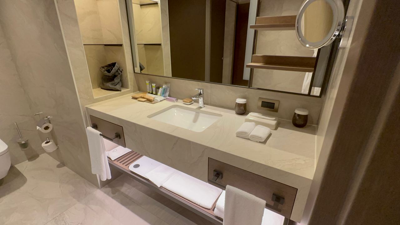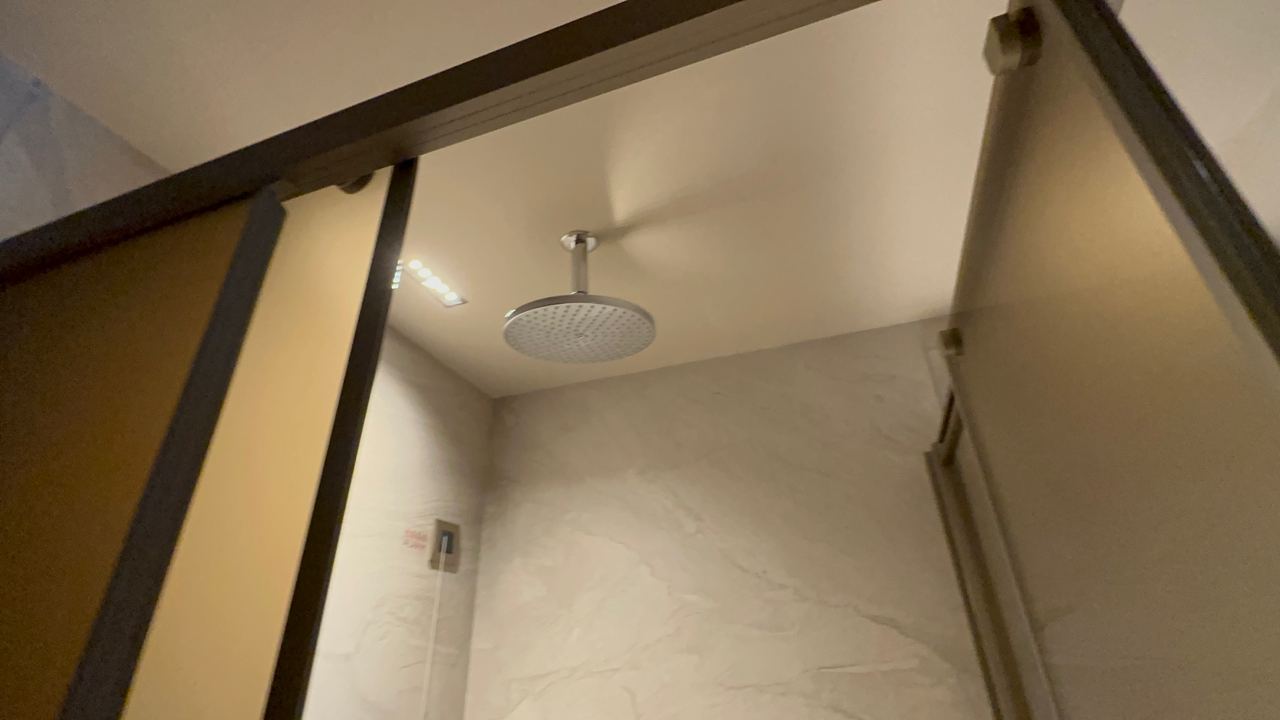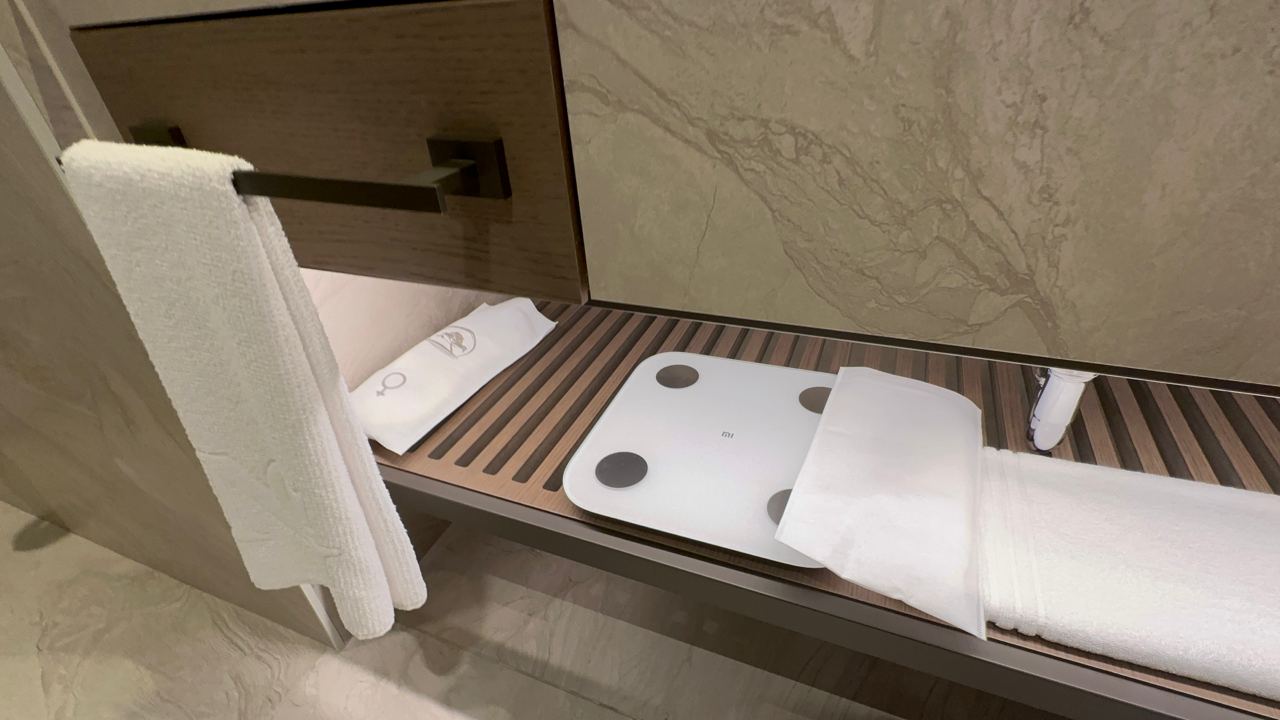 Банные и душевые принадлежности премиального класса, Весы цифровые (электронные), Два душа, Джакузи, Зеркало для макияжа/бритья с подсветкой, Пляжная сумка, Подставка под багаж, Пол - керамическая плитка, Тапочки, Тропический (дождевой) душ, Фен, Халаты, Чехол для одежды |