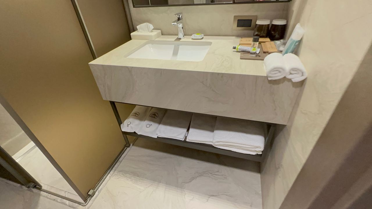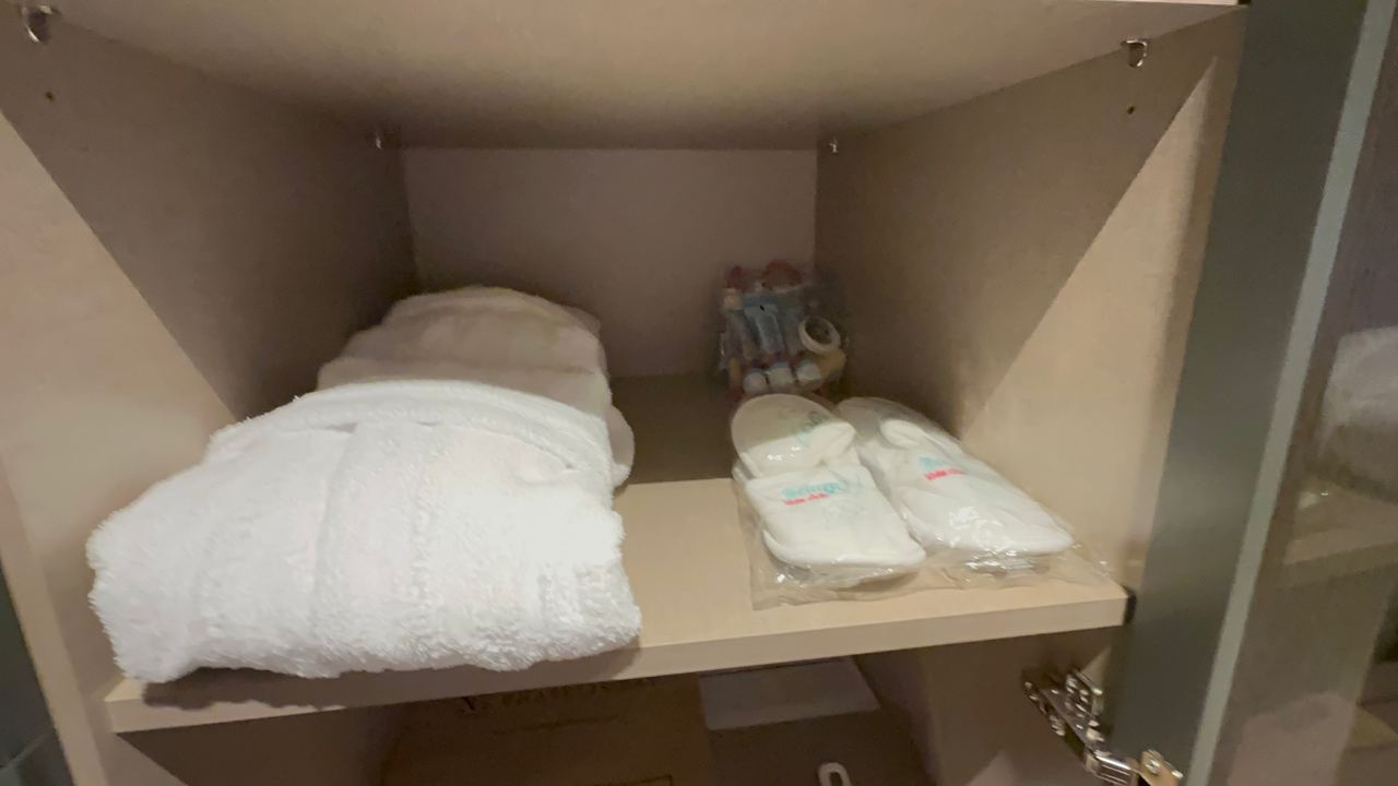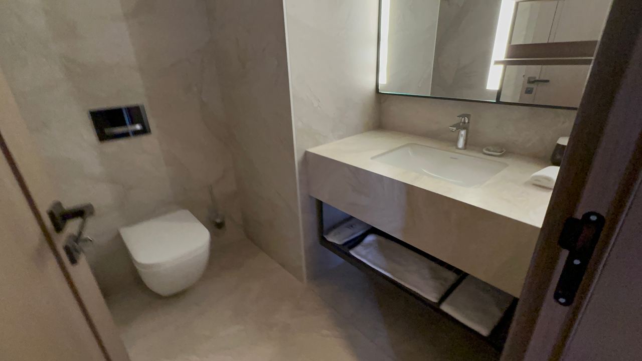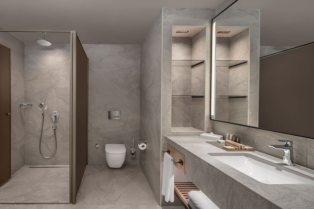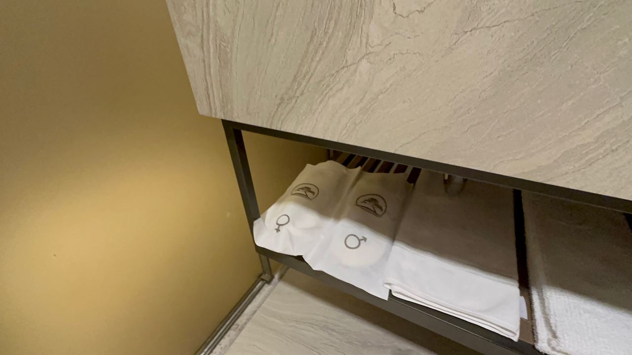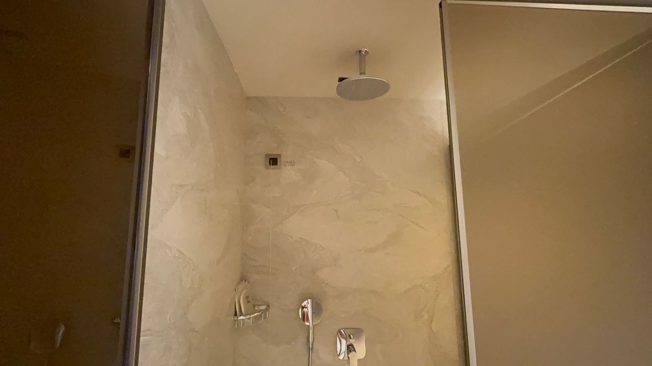 Банные и душевые принадлежности премиального класса, Весы цифровые (электронные), Два душа, Джакузи, Зеркало для макияжа/бритья с подсветкой, Пляжная сумка, Подставка под багаж, Пол - керамическая плитка, Тапочки, Тропический (дождевой) душ, Фен, Халаты, Чехол для одежды |