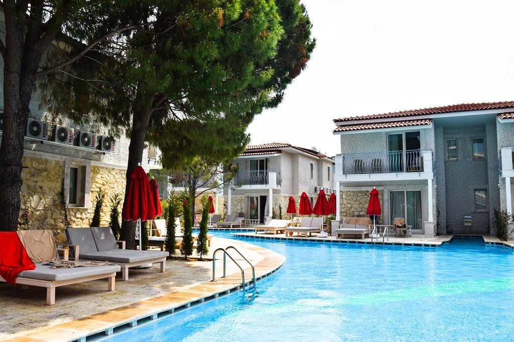 2 спальни с дверью (двуспальная кровать и 2 односпальные/выдвижная кровать из стены/двухъярусная кровать 90*190), 1 ванная комната, прямой выход к бассейну, макс.4 чел. |