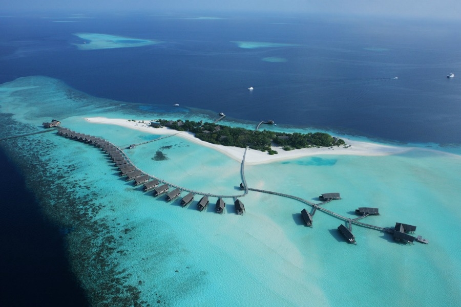 9 Dhoni Loft Water Villa (110 м2, макс. 3+1 чел.). Двухуровневые бунгало, выполненные в виде местной лодки дони. Первый уровень: гостиная с панорамным видом на океан, терраса с прямым спуском в воду, ванная комната. Второй уровень: спальня, небольшой санузел.