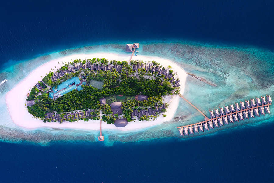 Домашний риф вблизи отеля, Частичные ограждения (волнорезы), Вид на местный обитаемый или большой необитаемый остров |