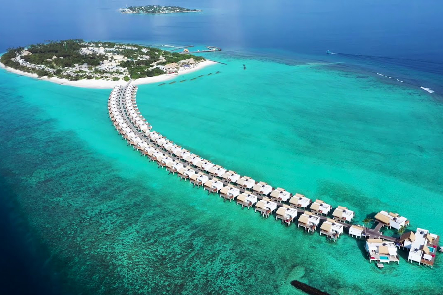 1 Presidential Water Villa (522 м2; макс. 6 взрослых). Водная вилла с двумя спальнями, двумя гардеробными, двумя ванными комнатами. Зона гостиной, кухня, барная стойка, комната для батлера, частный бассейн (10 х 4 м).
