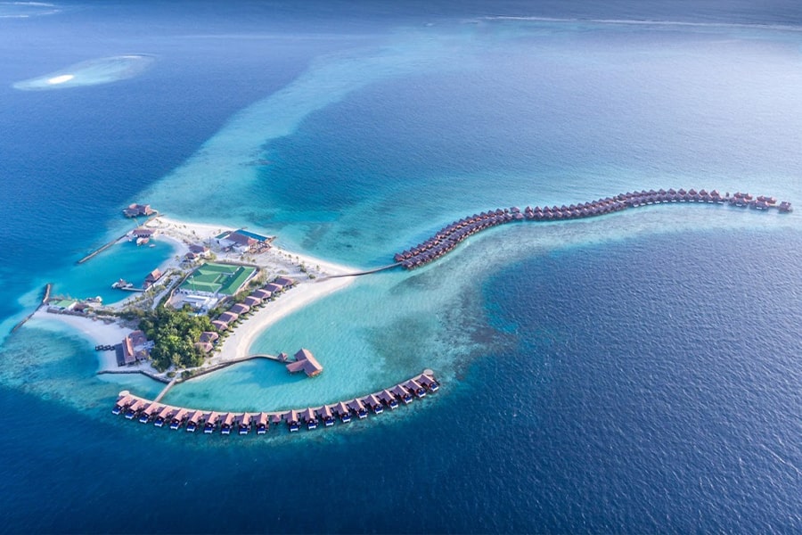 28 Ocean Water Villa (80 м2, макс. 3 или 2+2 реб.). Водные виллы, расположенные на стороне открытого океана. Спальня с кроватью king-size, стеклянная панель в полу, ванная комната с ванной и душем, душ на открытом воздухе. Терраса с шезлонгами, натяжной надводной сеткой-гамаком и зоной отдыха, прямой спуск в воду и доступ к рифу.
