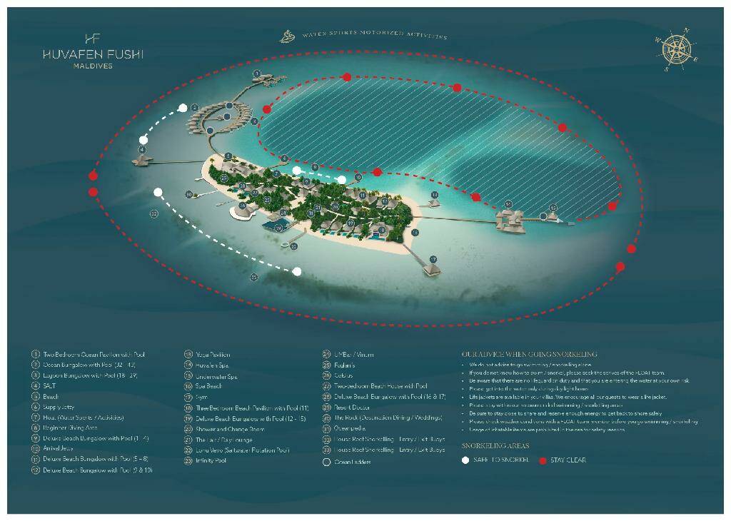 Домашний риф находится приблизительно в 25 метрах от пляжа, поэтому сюда можно добраться вплавь. Здесь довольно насыщенная подводная жизнь, поэтому во время снорклинга можно увидеть множество ярких рыб, акул, скатов и черепах. Хороший домашний риф и несколько ближайших дайв-сайтов – Manta Point, Shark Point, Rasfari, Peak, Hambadhu Shipwreck. Во время заплывов есть шанс увидеть мант, рифовых акул, останки затонувшего корабля. Вместе с морским биологом гости курорта могут отправиться на увлекательный снорклинг и посадить кораллы. |