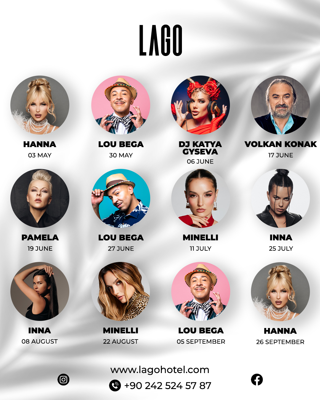 03.05.2024 Ханна, 30.05.2024 Lou Bega, 06.06.2024 DJ Катя Гусева, 17.06.2024 Volkan Konak, 19.06.2024 Pamela, 27.06.2024 Lou Bega, 11.07.2024 Minelli, 25.07.2024 Inna, 06.08.2024 Inna, 22.08.2024 Minelli, 05.09.2024 Lou Bega, 26.09.2024 Ханна |