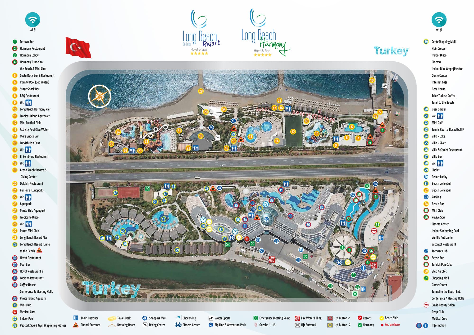 Время обслуживания и даты подогрева указанных бассейнов и аквапарков зависит от погодных условий и регулируется администрацией отеля. Время обслуживания и даты подогрева бассейнов могут меняться. Подогреваемые бассейны начинают функционировать с самого открытия сезона: Крытый бассейн для взрослых и детский бассейн, к которому, кстати, прилагается горка для радости маленьких гостей. Большой аквапарк на пляже (с 10 большими горками) и Пиратский аквапарк для детей ждут своих гостей с первых дней открытия. Панорамный бассейн Infinity Talasso с морской водой на пляже также будет функционировать для вашего максимального удовольствия