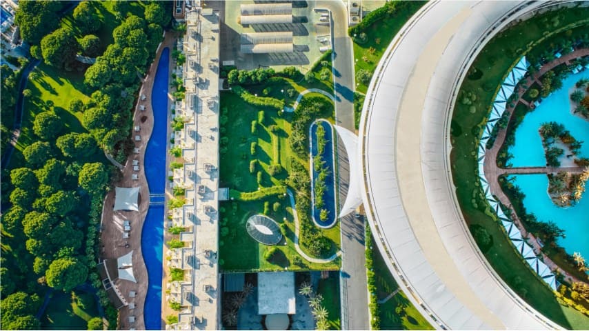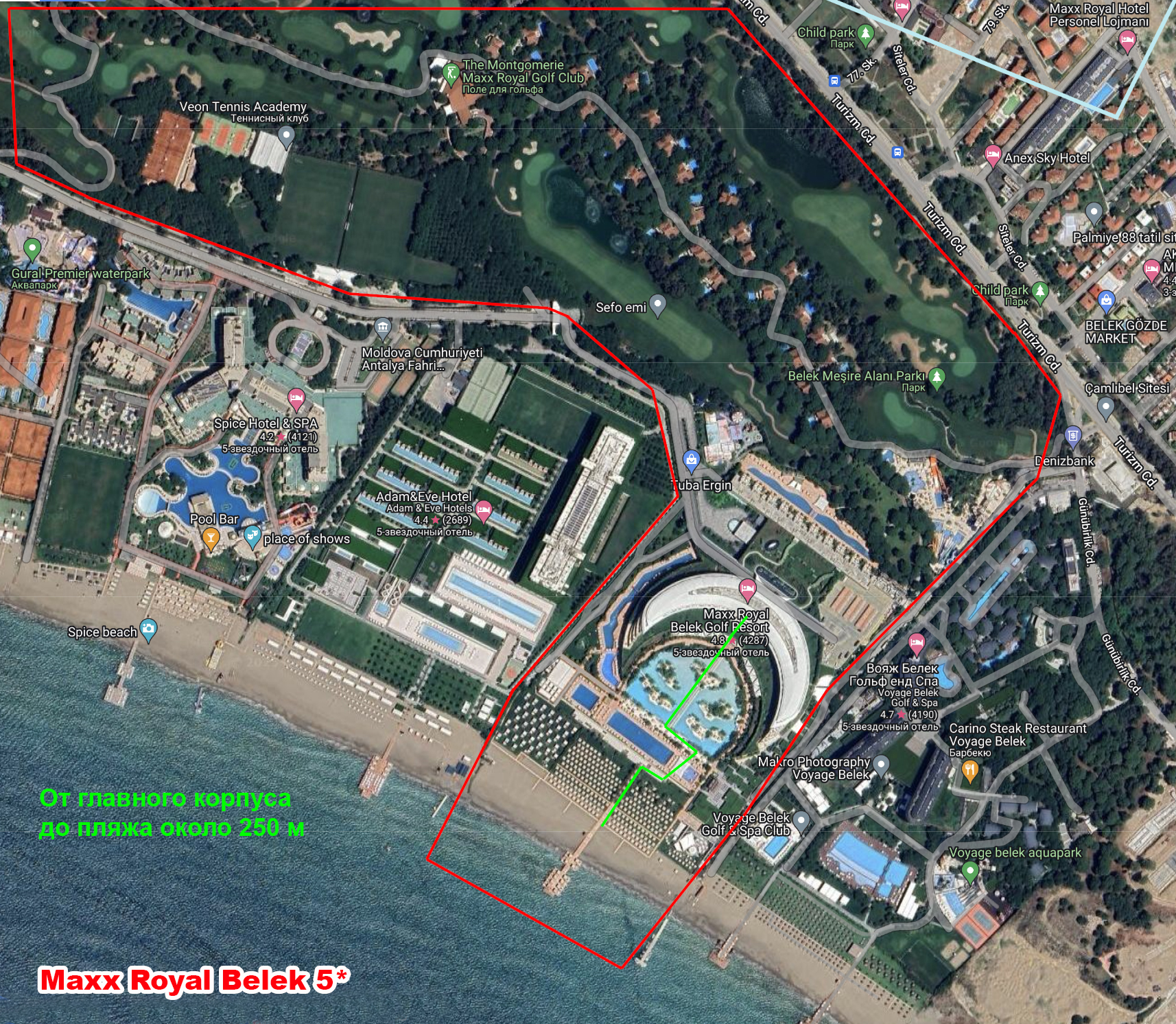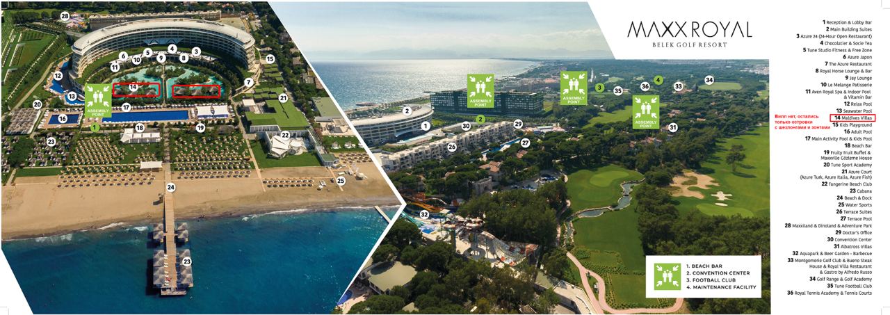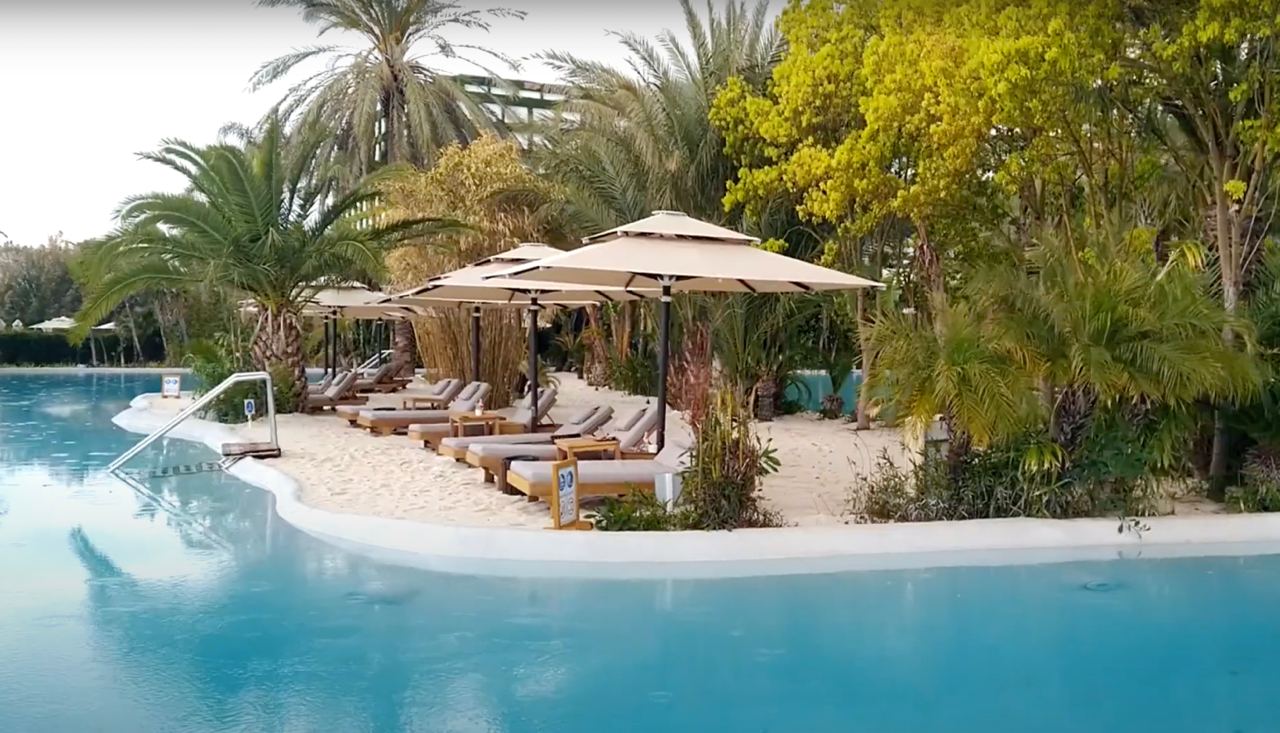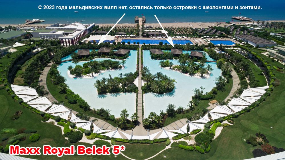 6 открытых бассейнов: Главный бассейн (без подогрева) - 1347 м ² Глубокий бассейн (для взрослых, без подогрева, глубина 2 м) - 445 м ² Террасный бассейн (без подогрева) - 1280 м ² Мальдивский бассейн (без подогрева). Бассейн Лагуна (без подогрева) - 360 м ² Бассейн с морской водой (подогревается в межсезонье) - 360 м ² |