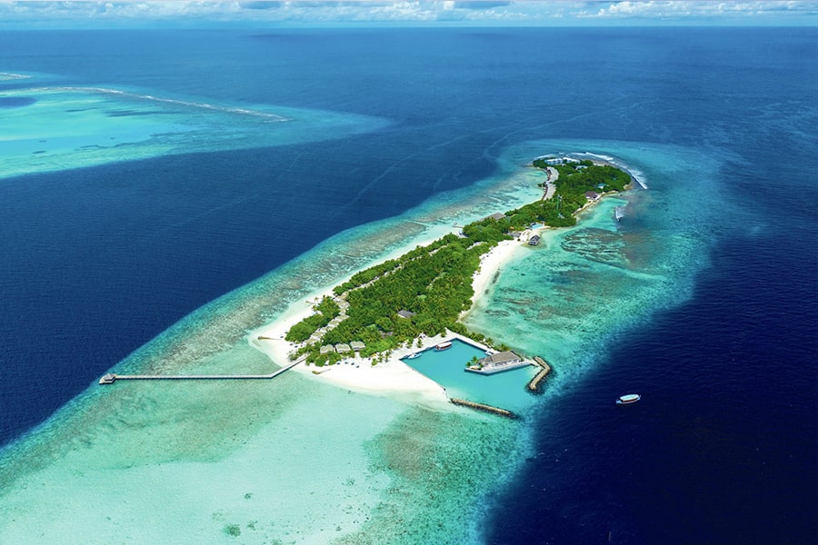 Домашний риф вблизи отеля, Песчаная коса, Частичные ограждения (волнорезы), Вид на соседний отель или свой остров из архипелага |