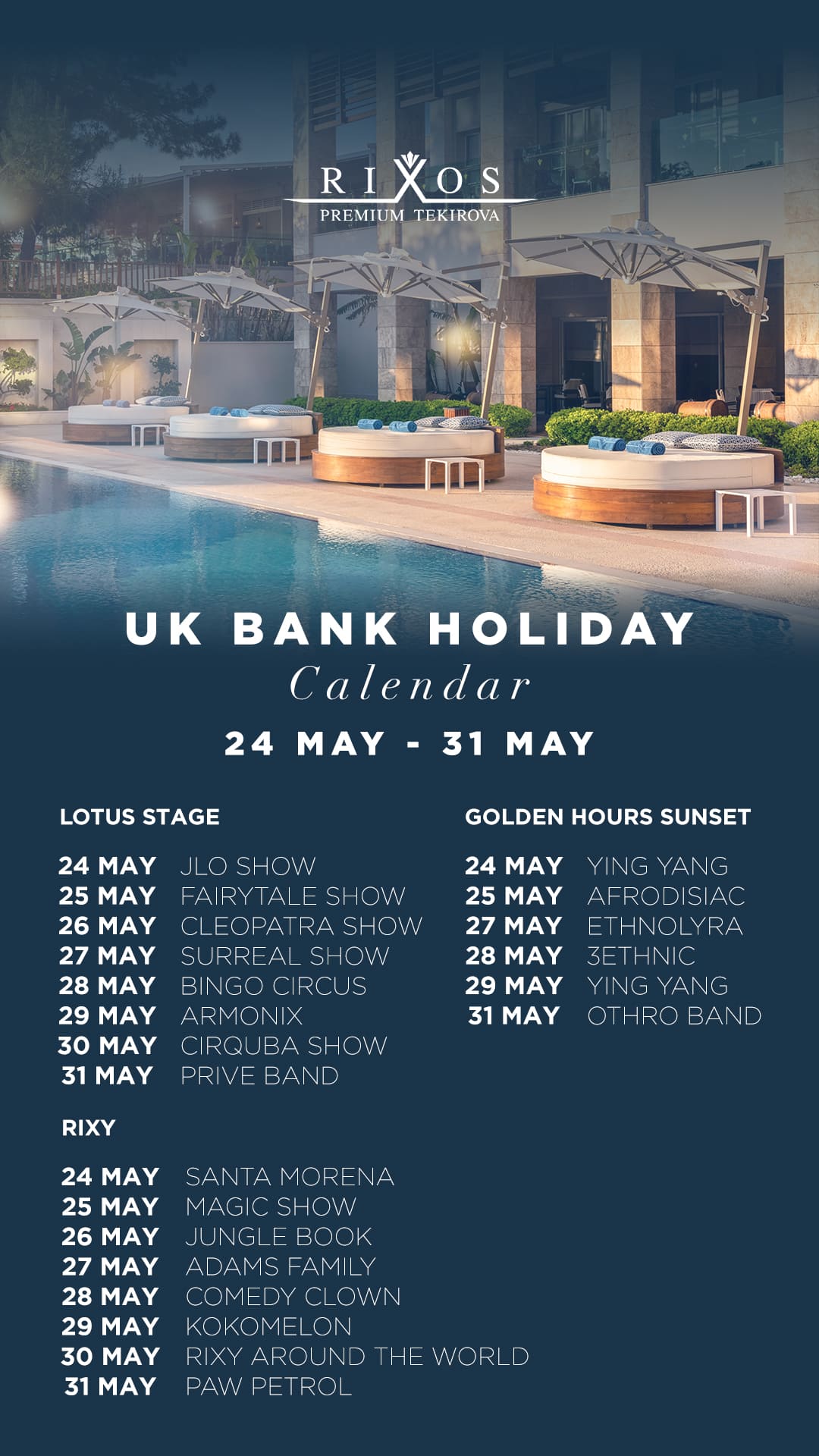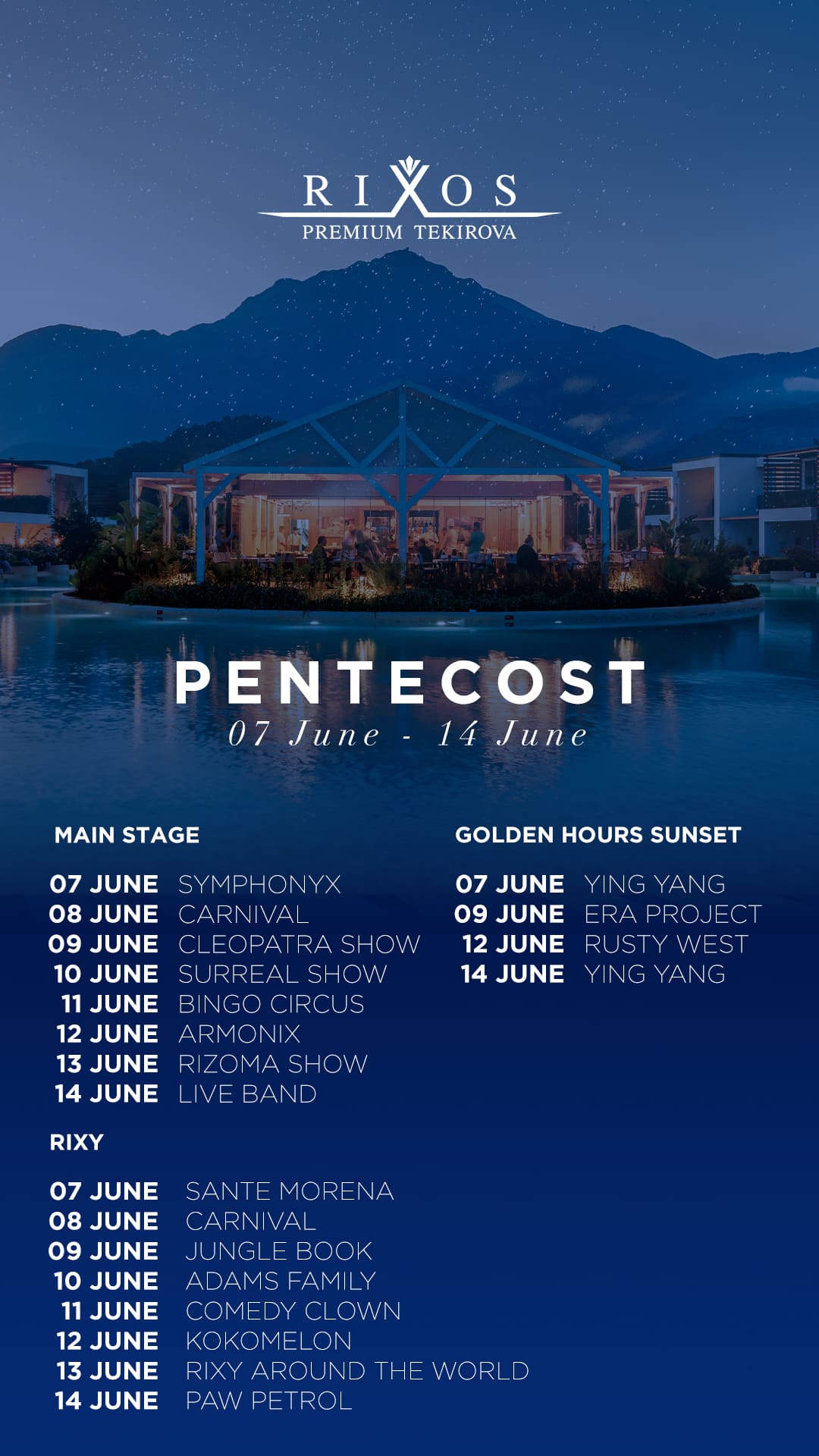 La A la carte ресторан A la Turca* (турецкая кухня, 19:00-22:00, по предварительной резервации) A la carte ресторан Mandarin* (дальневосточная кухня, 19:00-22:00, по предварительной резервации) A la carte ресторан La Rosetta (итальянская кухня, 19:00-22:00, платно, по резервации) A la carte ресторан Mermaid (рыбный, 19:00-22:00, платно, по резервации) A la carte ресторан Cactus (южноамериканская кухня, 19:00-22:00, платно, по резервации) GRILLAND барбекю ресторан* , 19:00-22:00, по предварительной резервации), PEOPLE’S* интернациональная кухня 19:00-22:00, по предварительной резервации) PEOPLE’S 24/7 — a la carte (на время ужина необходима резервация) Exclusive Club (ресторан международной кухни для гостей, проживающих в Executive Villa, Superior Villa и King Suite 24 часа бесплатно). Для посещения A la Carte ресторанов необходимо предварительное бронирование. *При проживании более 4х ночей предоставляется возможность забронировать два из бесплатных A la Carte ресторана (при наличии свободных мест). Повторное посещение бесплатного A la Carte рестрана возможно за дополнительную плату. При бронировании отеля менее, чем на 4 ночи, все рестораны A’la Carte оплачиваются дополнительно. При бронировании A la Carte ресторанов детям от 7 до 11,99 лет предоставляется 50% скидка, дети от 0 до 6,99 лет бронируются бесплатно. A la Carte рестораны не принимаются групповые резервации. A la Carte рестораны открыты 6 дней в неделю. |