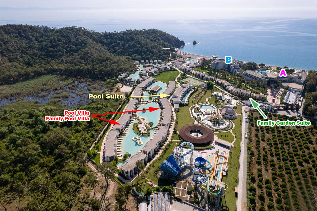 Два основных здания (3-этажное основное здание Deluxe и 7-этажное здание Family Deluxe), 2- и 3-этажные Family Garden Suites и комплекс 2-этажных вилл. |