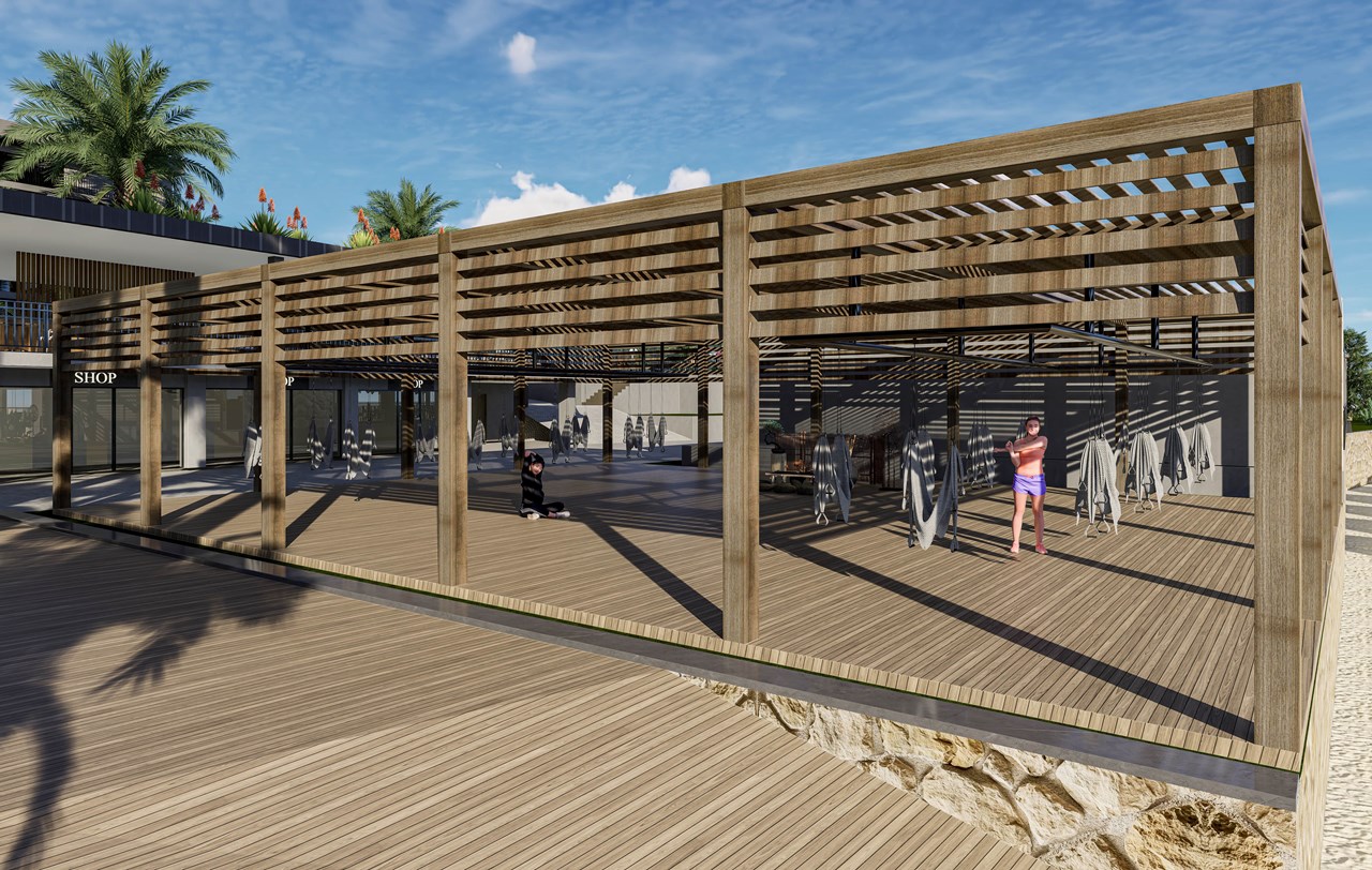Бар на пляже (включен в концепцию), Пирс, Пляжные беседки (кабаны, газебо, павильоны, шатры) платно, Пляжные полотенца (бесплатно), Шезлонг, зонт (бесплатно) |