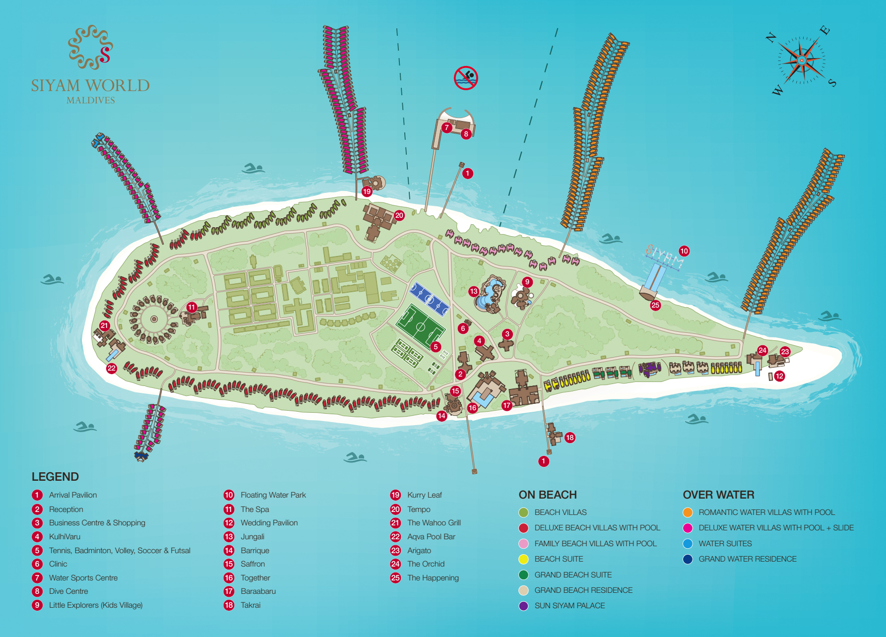 - 1 Grand Water Pavilion with Pool + Slide (350 м², макс. 6 или 4+2 чел.). Просторная водная вилла с двумя спальнями (кровати emperor-size), двумя ванными комнатами. Две обеденных зоны (в помещении и на террасе), кухонный уголок. Ванна с функцией джакузи. Терраса с частным бассейном, водной горкой и прямым спуском в воду.