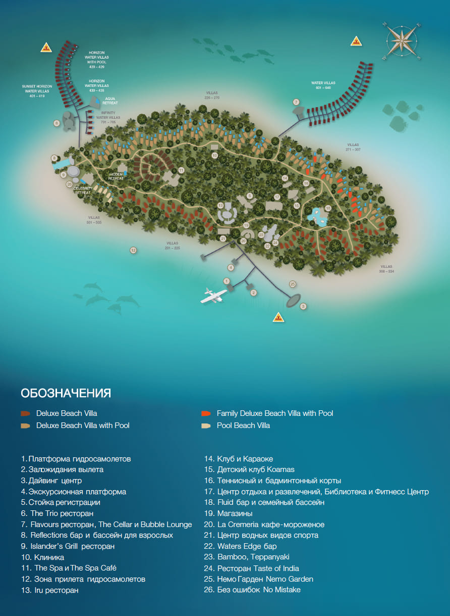 Трансфер: 45 минут на гидросамолете (с 06:00 до 16:00) или 35 минут на самолете внутренних авиалиний до местного аэропорта Ифуру (в соответствии с расписанием рейсов) + 45 минут на скоростном катере до отеля.