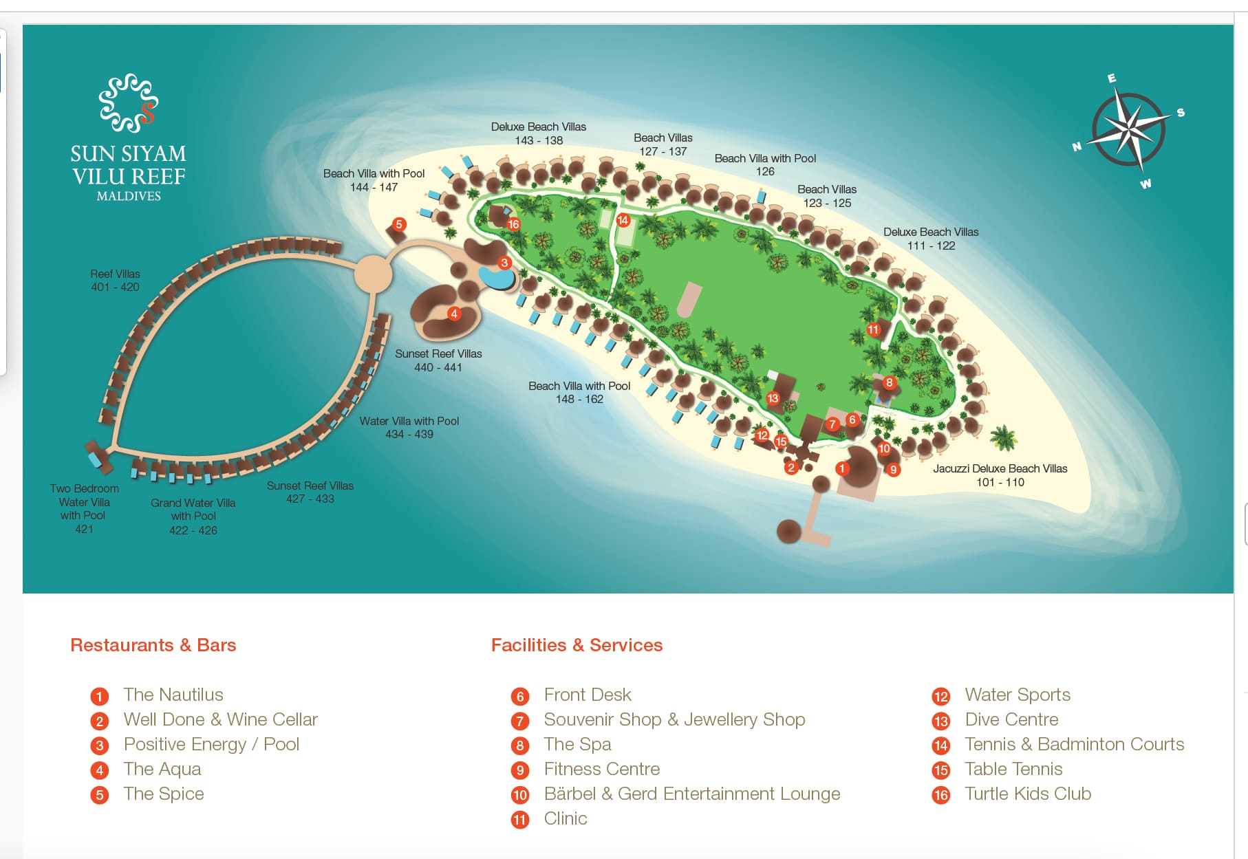 - 10 Jacuzzi Deluxe Beach Villa (76 м², макс. 3 или 2+2 чел.). Виллы аналогичны номерам Deluxe Beach Villa, но дополнительно имеют беседку с мальдивскими качелями и джакузи (iSPA-ванна) в ванной комнате.