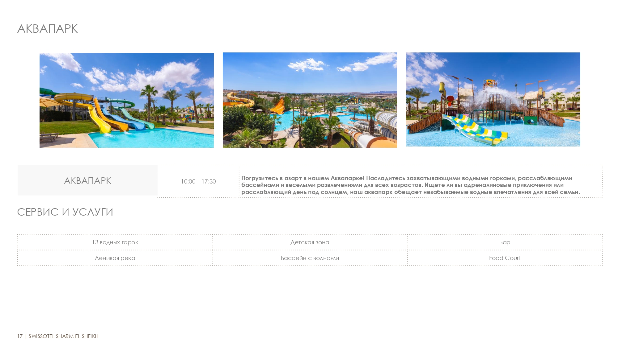 - Два главных ресторана и два фудкорта (пляж и аквапарк).