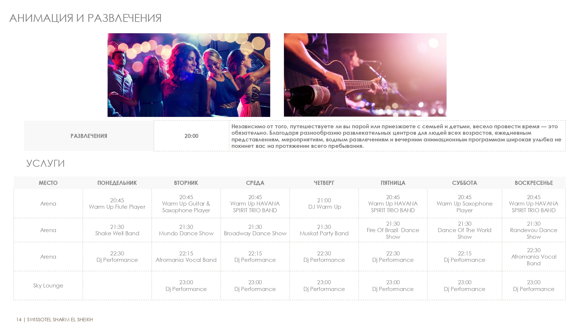 Анимация вечерняя, Анимация дневная, Вечеринки пляжные, Ди-джей, Дискотека, Живая музыка, Шоу-программы вечерние (профессиональные) |