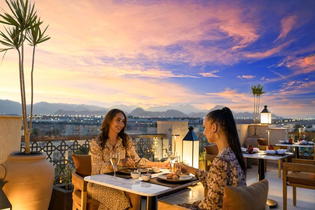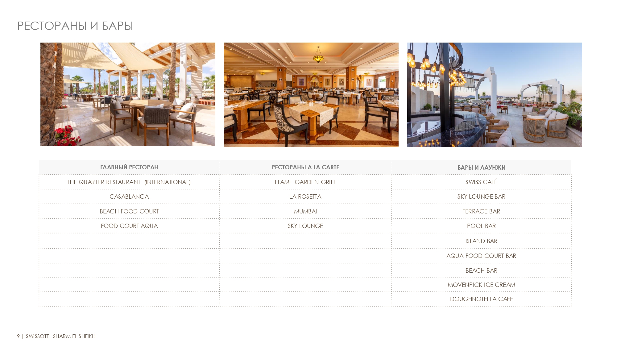 Бар в лобби, Бар на высоком этаже/rooftop bar, Бар на пляже, Бар только для взрослых, Барбекю, Детокс-бар, Кальян-кафе, кальянная, Кафе/магазин шоколада, Магазин мороженого Movenpick, Основной (главный) ресторан, Ресторан с открытой террасой, Ресторан(ы) по меню (а ля карт), Фуд-корт |