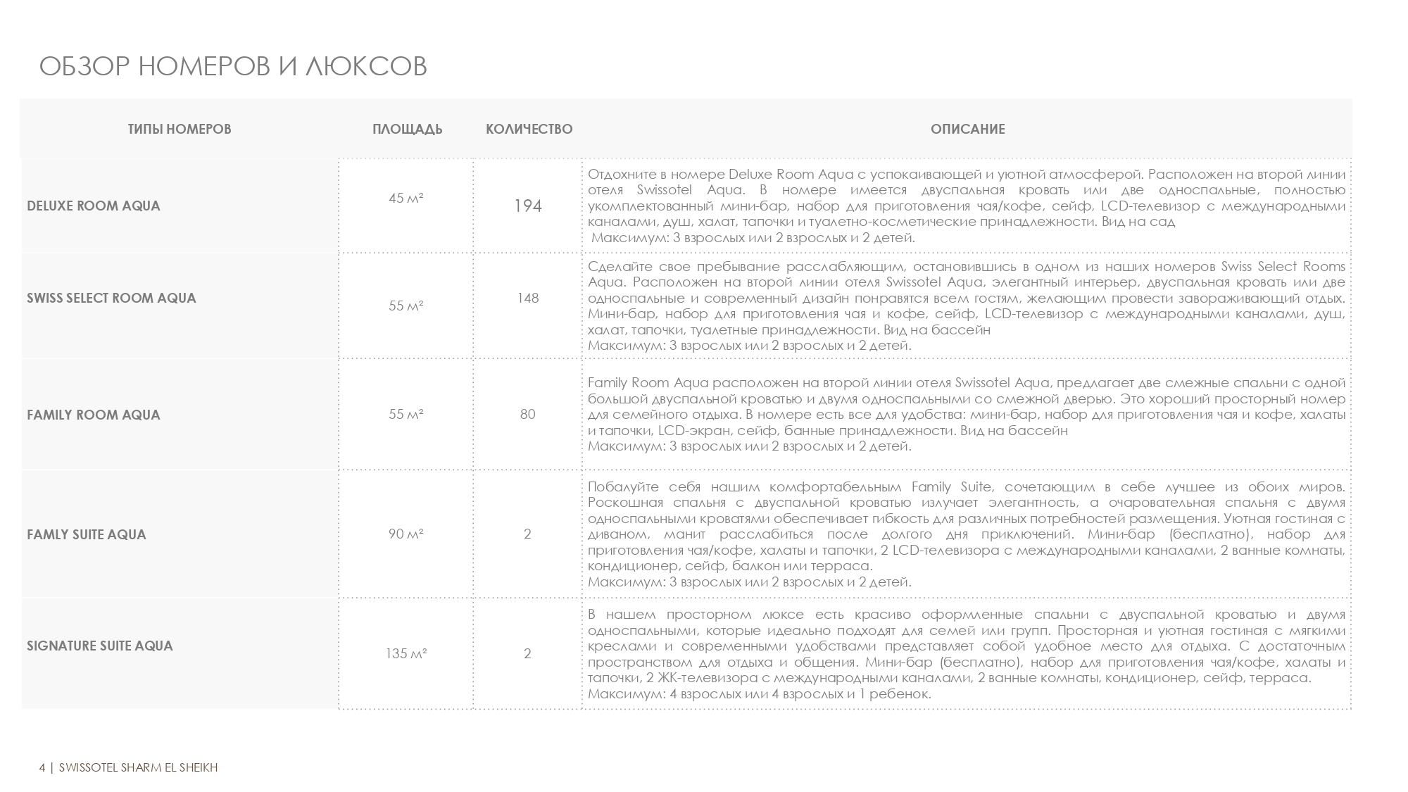 - 148 SWISS SELECT ROOM AQUA 55 м² Сделайте свое пребывание расслабляющим, остановившись в одном из наших номеров Swiss Select Rooms Aqua. Расположен на второй линии отеля Swissotel Aqua, элегантный интерьер, двуспальная кровать или две односпальные и современный дизайн понравятся всем гостям, желающим провести завораживающий отдых. Мини-бар, набор для приготовления чая и кофе, сейф, LCD-телевизор с международными каналами, душ, халат, тапочки, туалетные принадлежности. Вид на бассейн Максимум: 3 взрослых или 2 взрослых и 2 детей.