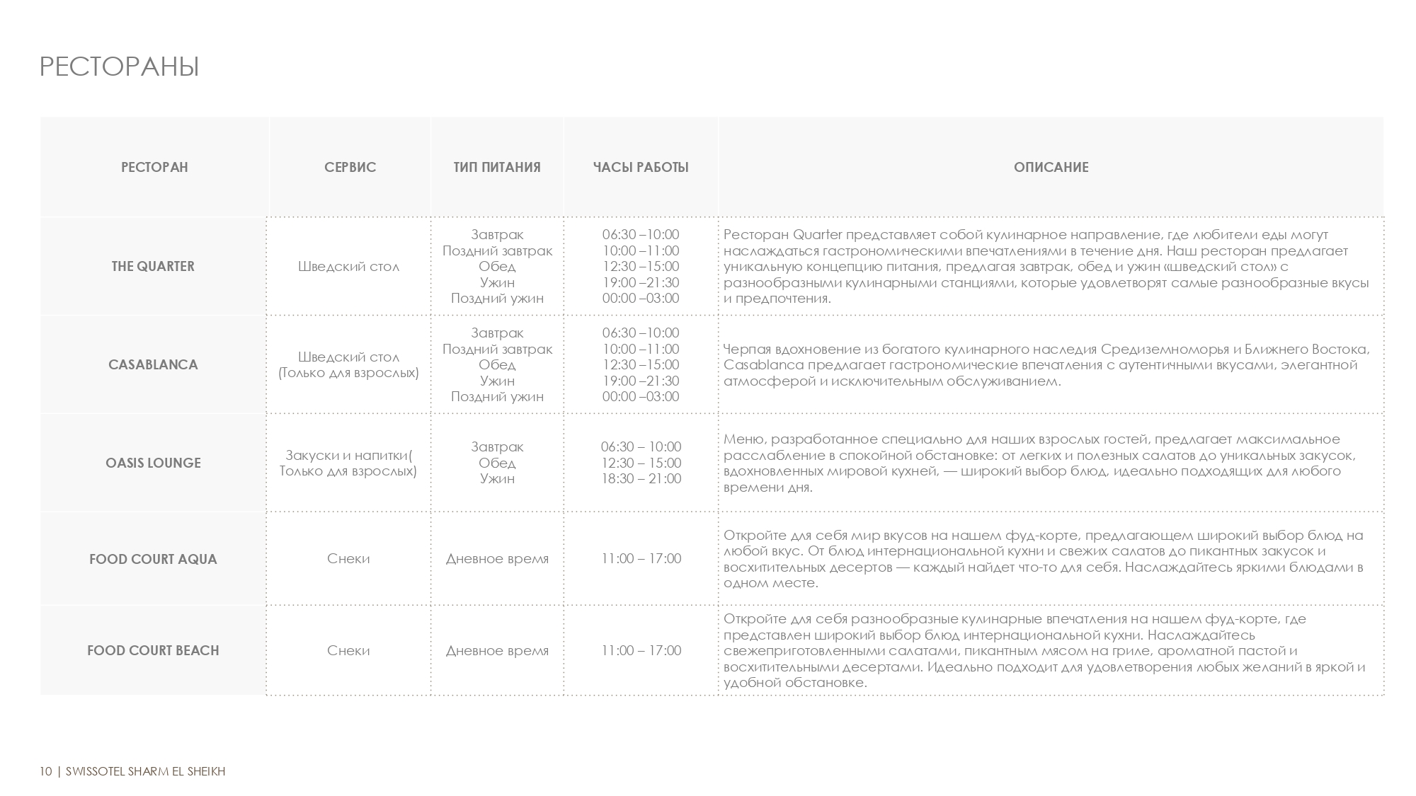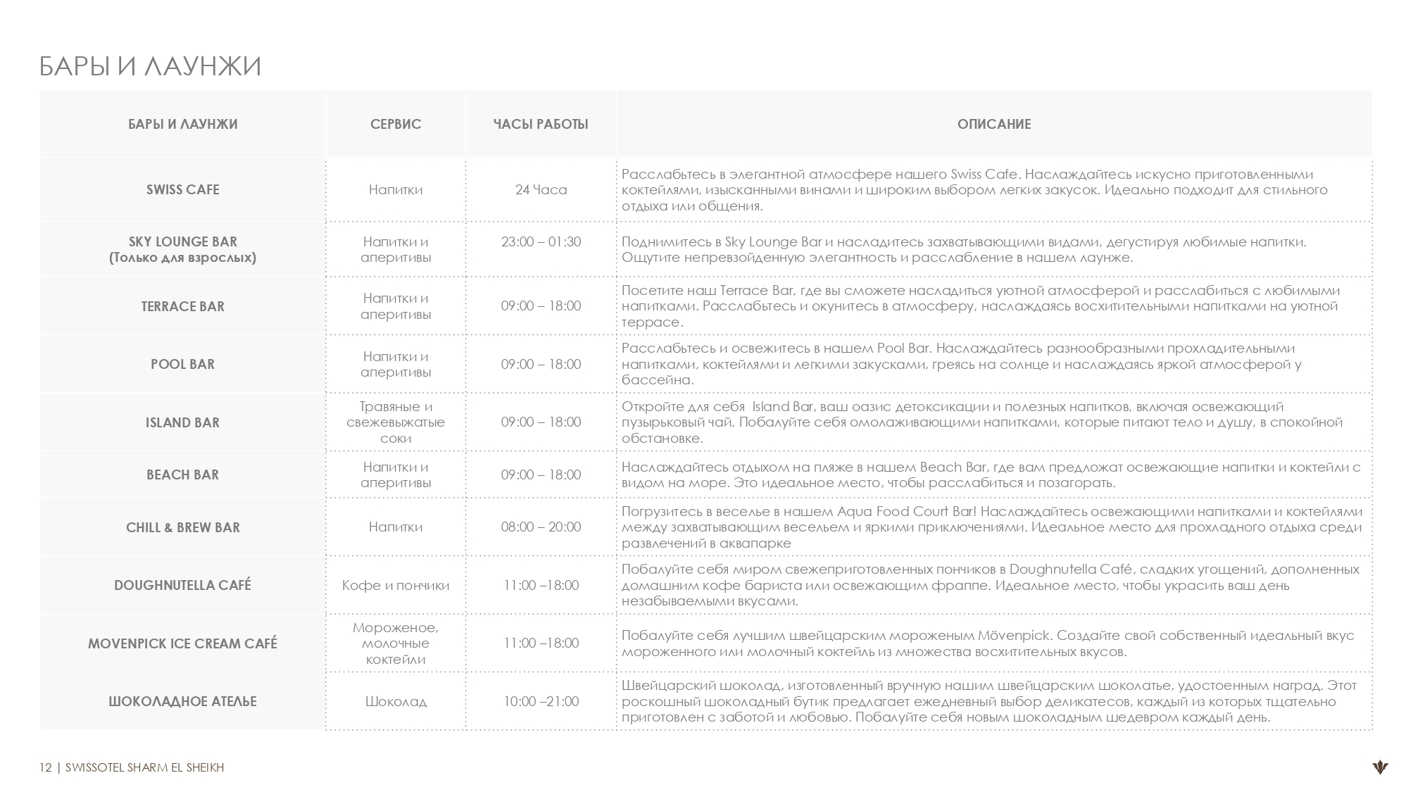 Swiss cafe, работает круглосуточно Sky Lounge Bar (18+) 23:00 – 01:30 Terrace Bar 09:00 – 18:00 Pool Bar 19:00 – 00:00 Island Bar 09:00 – 18:00 Beach Bar 09:00 – 00:00 Chill and Brew bar 08:00 – 20:00 Movenpick Ice Cream 11:00 – 18:00 Doughnotella Cafe 11:00 – 18:00 Candy Man 13::00 – 14:00 Chocolate Atelier 10:00 – 21:00 Nargila Shisha Lounge 19:00 – 00:00 |