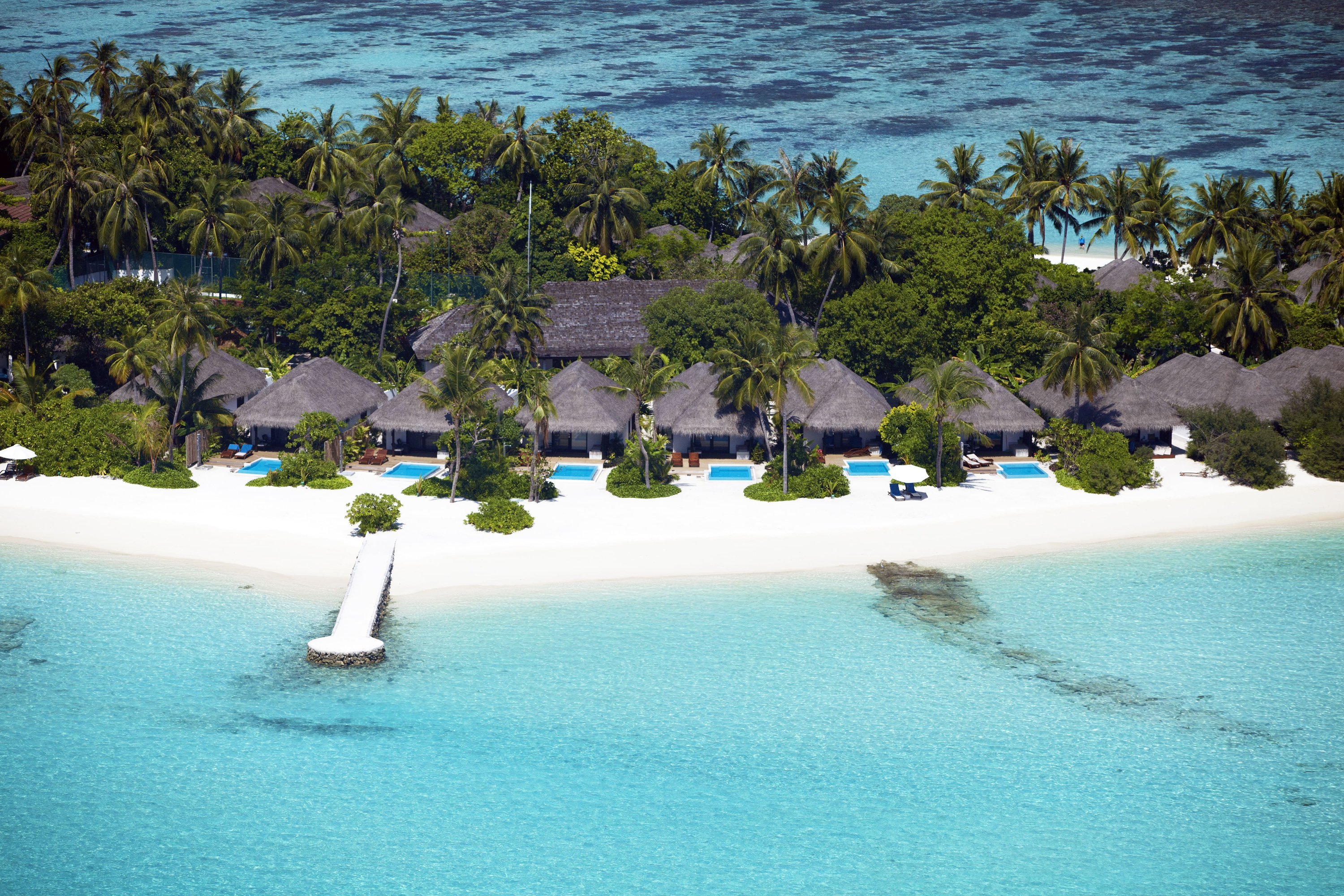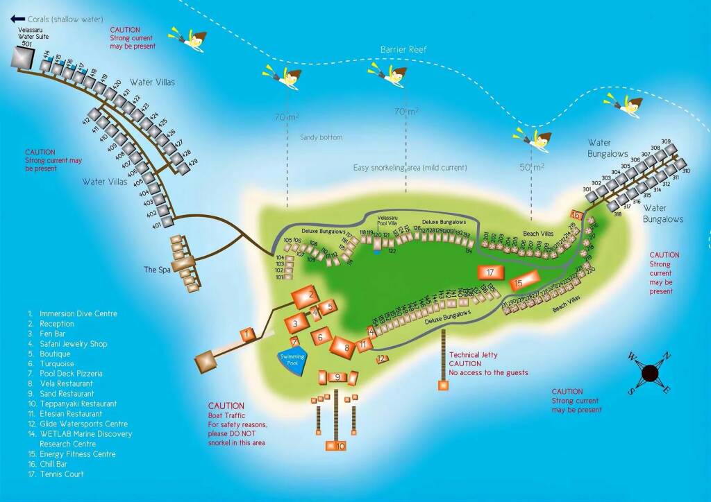 1 Water Suite (270 м2, макс. 2 чел.). Вилла расположена на сваях в водах лагуны: гостиная со стеклянной панелью в полу, спальня с кроватью king-size, большая открытая терраса с зоной отдыха и индивидуальным спуском в воду, беседка с обеденным столом, частный бассейн-каскад (15х3,2 м), большая ванна в ванной комнате, ливневый душ под открытым небом, барная стойка со стульями, винный мини-холодильник, шкаф для одежды во всю стену, телевизор с плоским экраном, система «домашний кинотеатр». Круглосуточно услуги персонального батлера.