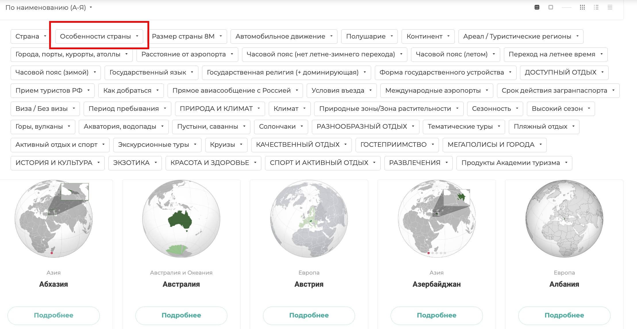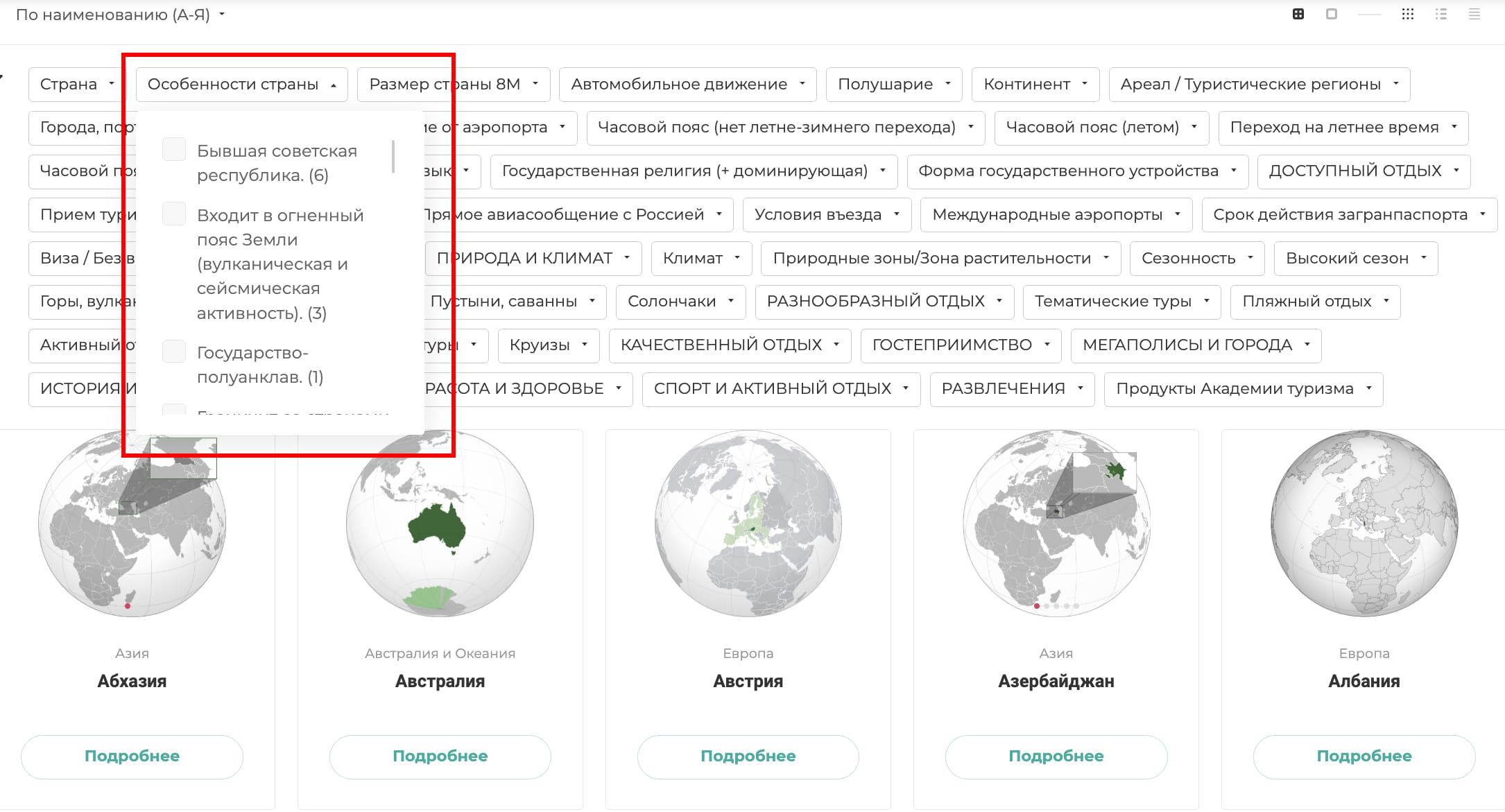 В разделе СТРАНЫ самым первым мы поставили фильтр "Особенности страны". Про него и расскажем в первой части блога, посвященного странам.