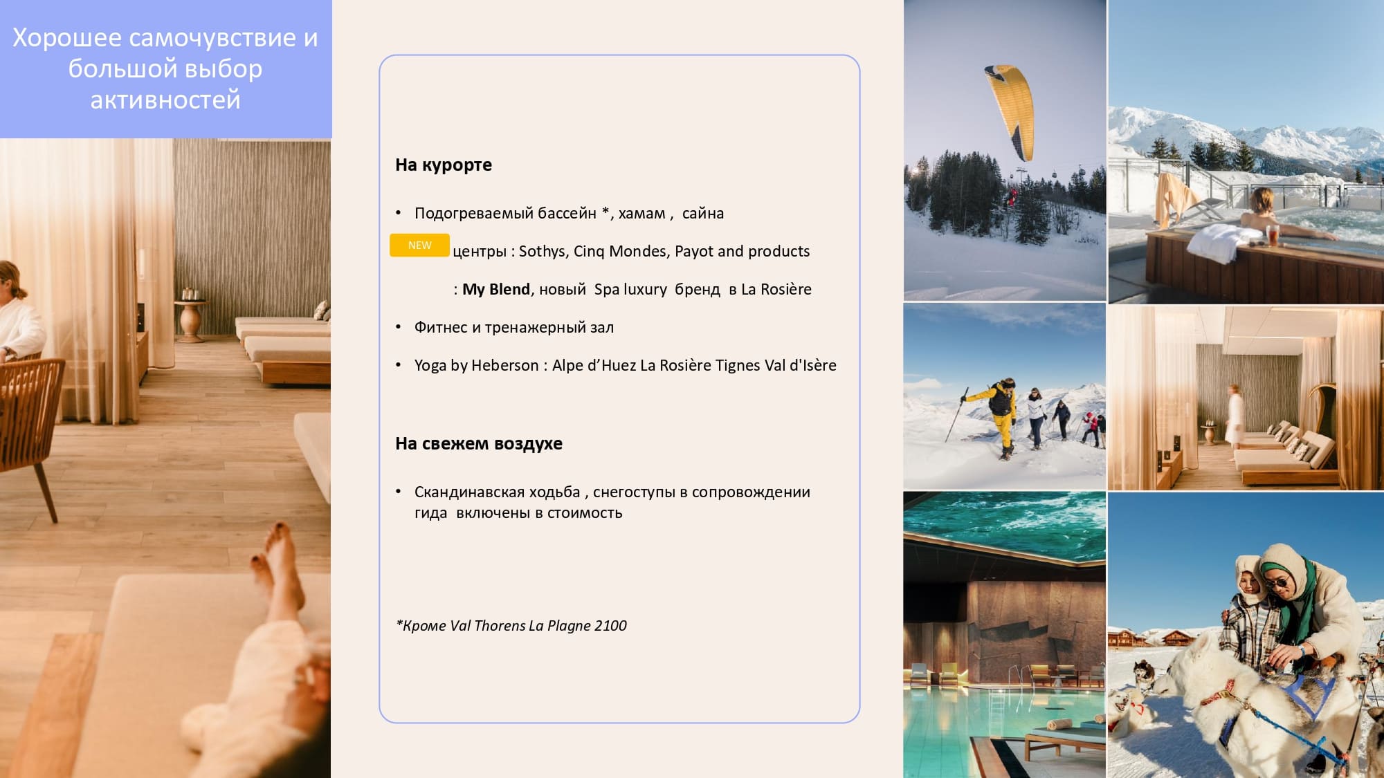 Club Med предлагает широкий спектр возможностей для поддержания хорошего самочувствия и активного отдыха:- Подогреваемый бассейн, хаммам и сауна: Расслабьтесь и восстановите силы после дня на склонах.