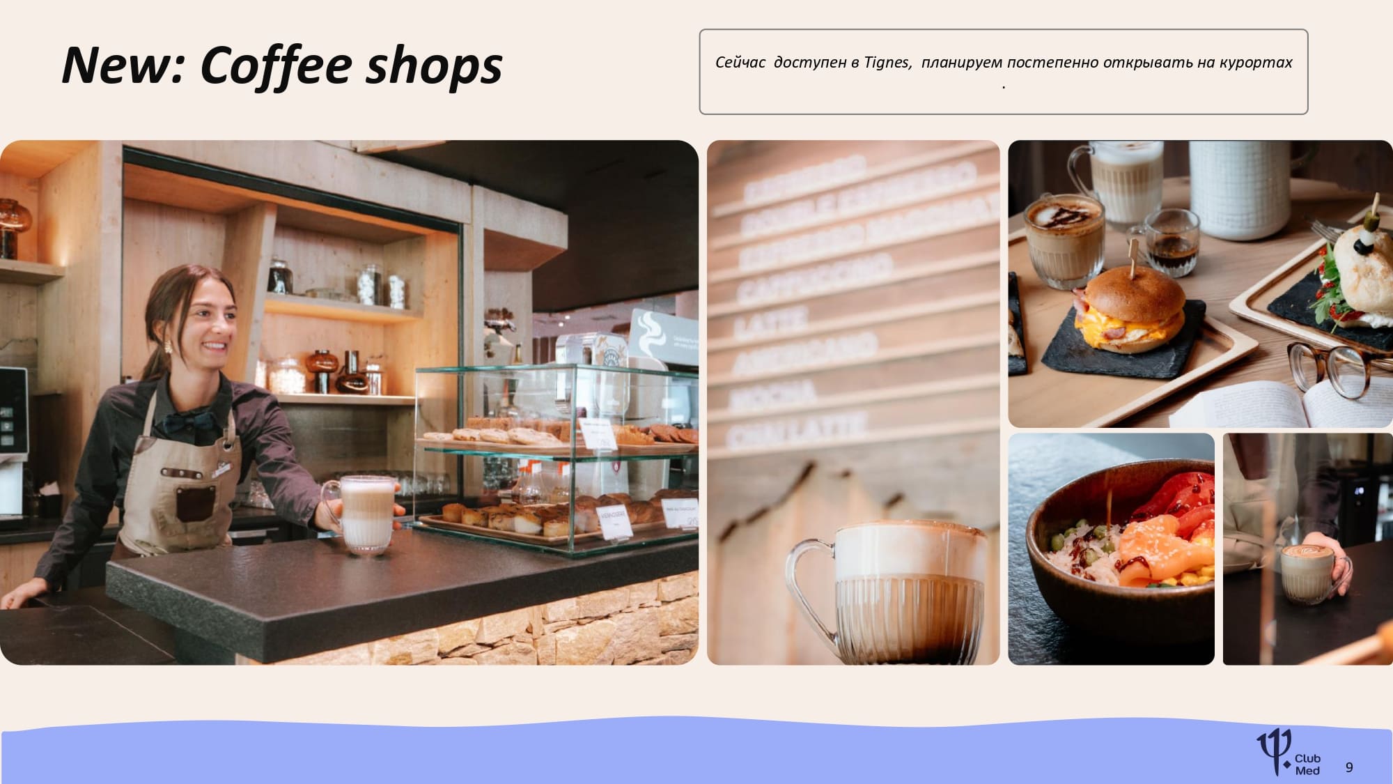 - Coffee shops: Насладитесь ароматным кофе и вкусными десертами (доступно в Tignes, планируется открытие на других курортах).