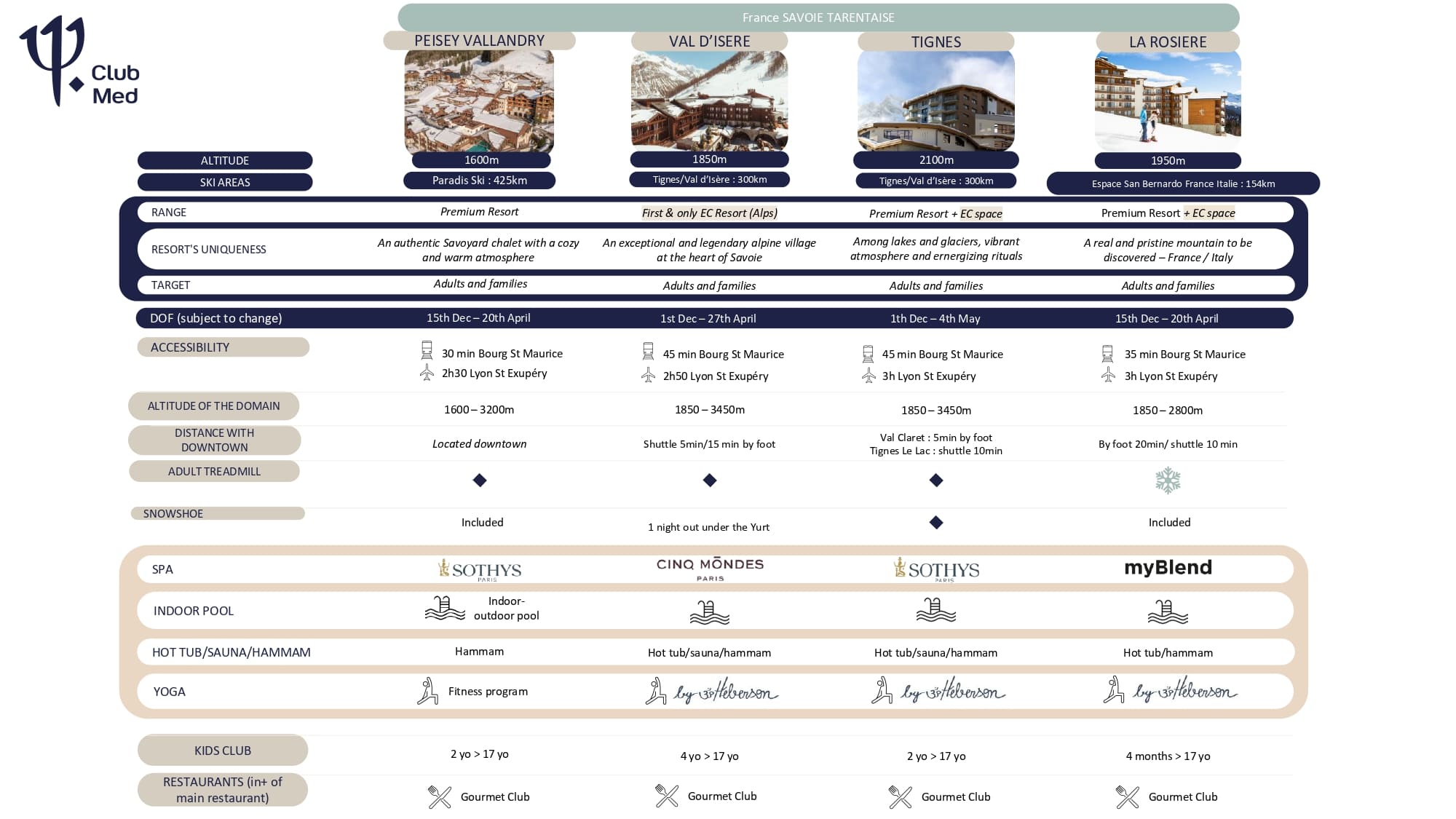 - Детский клуб: Club Med обеспечивает заботу о детях от 4 месяцев до 17 лет с квалифицированным персоналом в Kids Club. Родители могут спокойно наслаждаться катанием, зная, что их дети в надежных руках (включено в стоимость с 4-х лет).