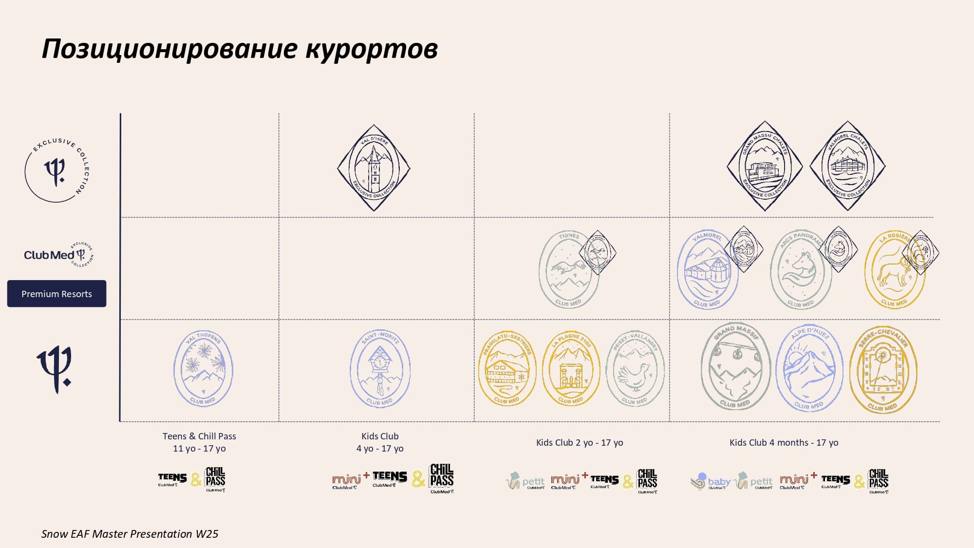 - Европа: 16 курортов во Франции (Alpe d’Huez, Arcs Panorama, Grand Massif Samoëns Morillon, La Plagne 2100, La Rosière, Peisey-Vallandry, Serre Chevalier, Tignes, Val d’Isère, Val Thorens, Valmorel), Италии (Pragelato) и Швейцарии (Saint-Moritz).