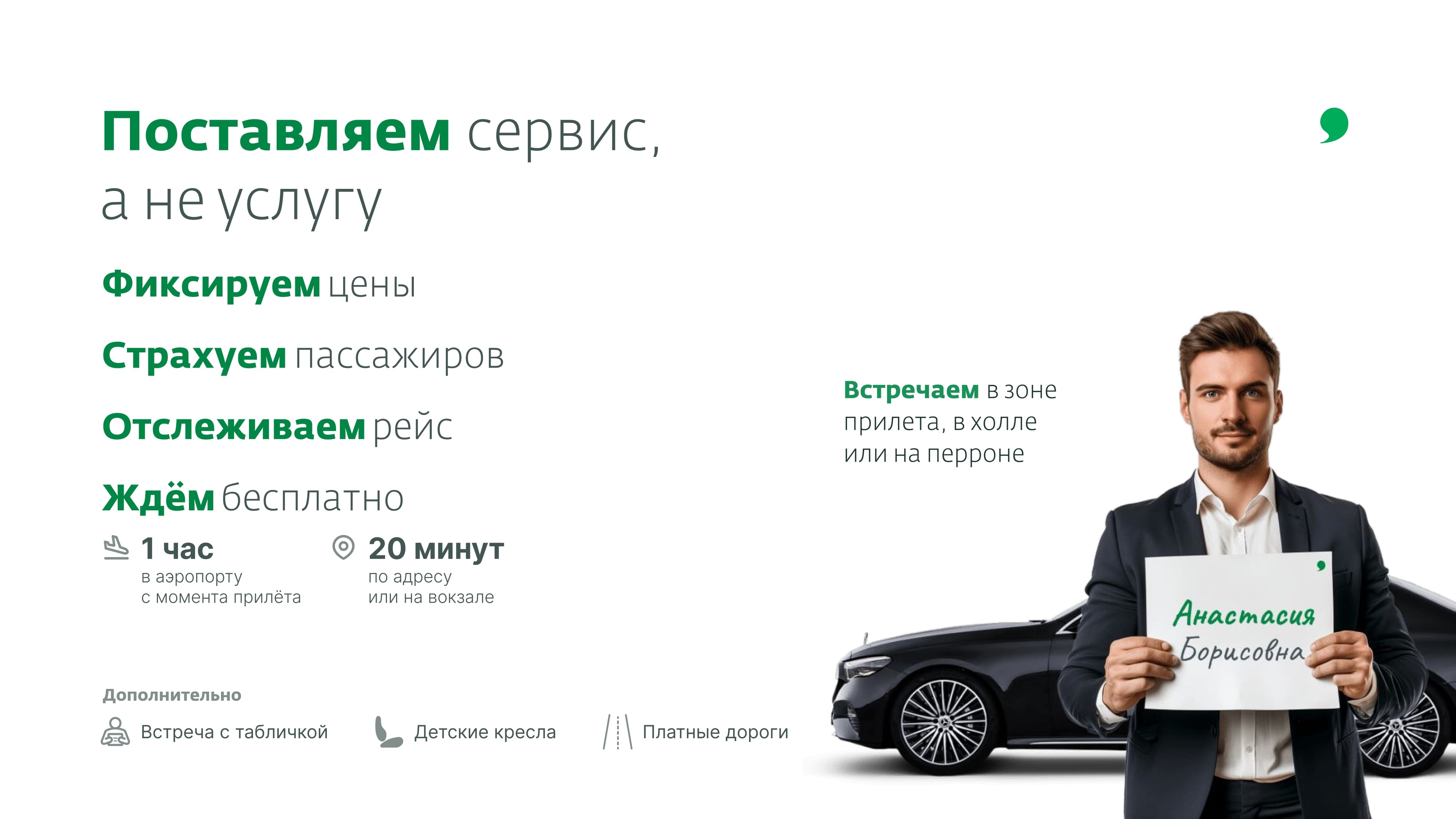 - Своевременная подача автомобиля (мониторинг рейсов в а/п, предварительное предоставление информации о водителе и авто)