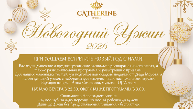 - Новогодний банкет в отеле «Catherine Art Hotel» (14 000 руб.): Новогодний банкет в ресторане отеля, зажигательная ведущая – Анна Соловьева, популярный DJ Vanson, развлекательная программа, розыгрыши с призами, сладкие подарки от Деда Мороза для маленьких гостей.