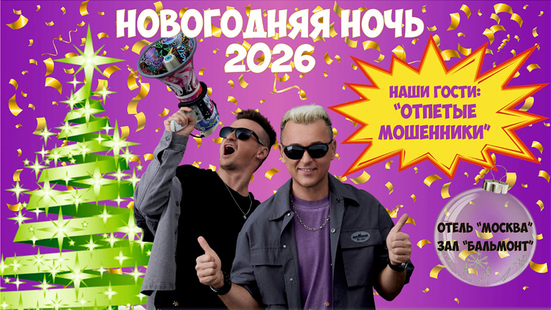 - Новогодний банкет в отеле «Москва» (20 000 руб.): Музыкальная группа «Отпетые Мошенники», праздничный ужин от шеф-повара, игристое вино без ограничений, шоу-программа с воздушными гимнастами, конкурсы и призы.