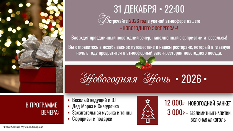 - Новогодний банкет в отеле «Экспресс Садовая» (12 000 руб.): Праздничная атмосфера, веселый ведущий и DJ, Дед Мороз и Снегурочка, зажигательная музыка и танцы, сюрпризы и подарки.