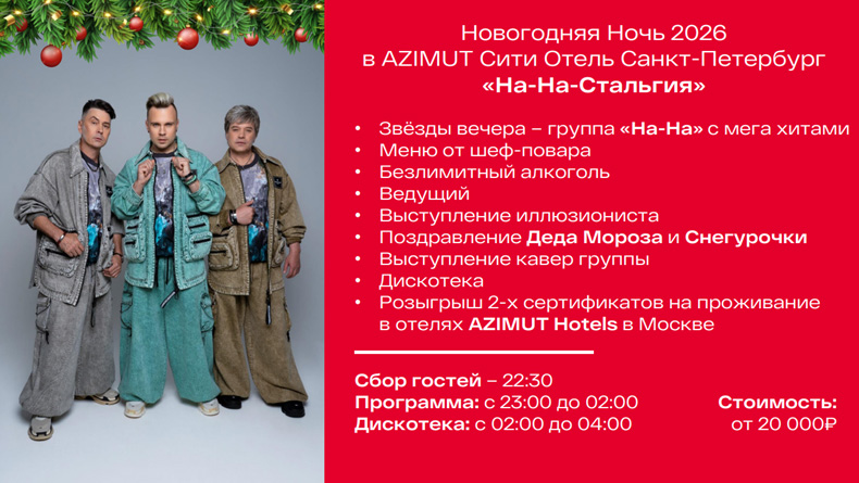 - Новогодний банкет в отеле «Азимут» (20 000 руб.): Приглашенная звезда – группа «НА-НА», праздничный банкет от шеф-повара, безлимитный бар, ведущий с увлекательной программой, выступление кавер-группы, поздравление Деда Мороза и Снегурочки, розыгрыш двух сертификатов на проживание в отелях Azimut Hotels в Москве.