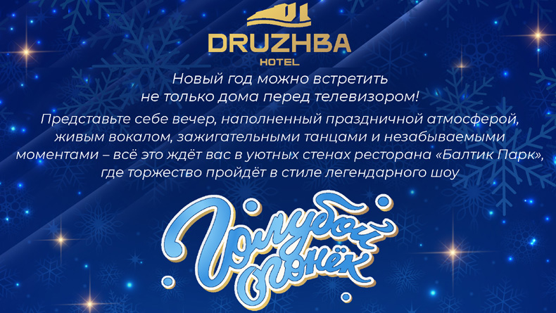 - Новогодний банкет в отеле «Дружба» (16 500 руб.): Праздничный банкет от шеф-повара в стиле легендарного шоу «Голубой огонёк», ведущий, диджей, Дед Мороз, праздничная программа, дискотека.